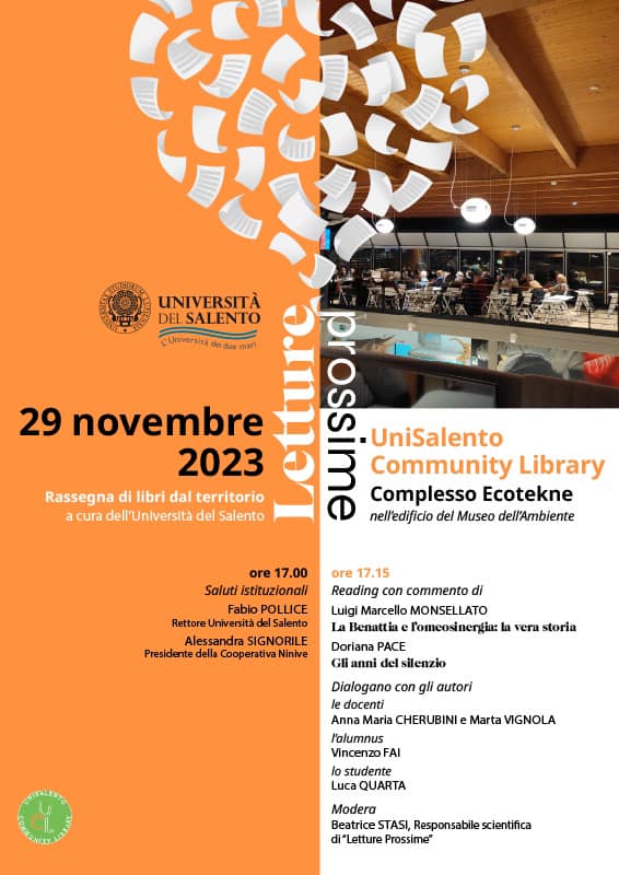 Gli incontri dell’iniziativa “Letture prossime. Rassegna di libri dal territorio” proseguiranno mercoledì 29 novembre, alle ore 17, negli spazi della Community Library dell’Università del Salento, nell’edificio Museo dell’Ambiente, nel Complesso Ecotekne.