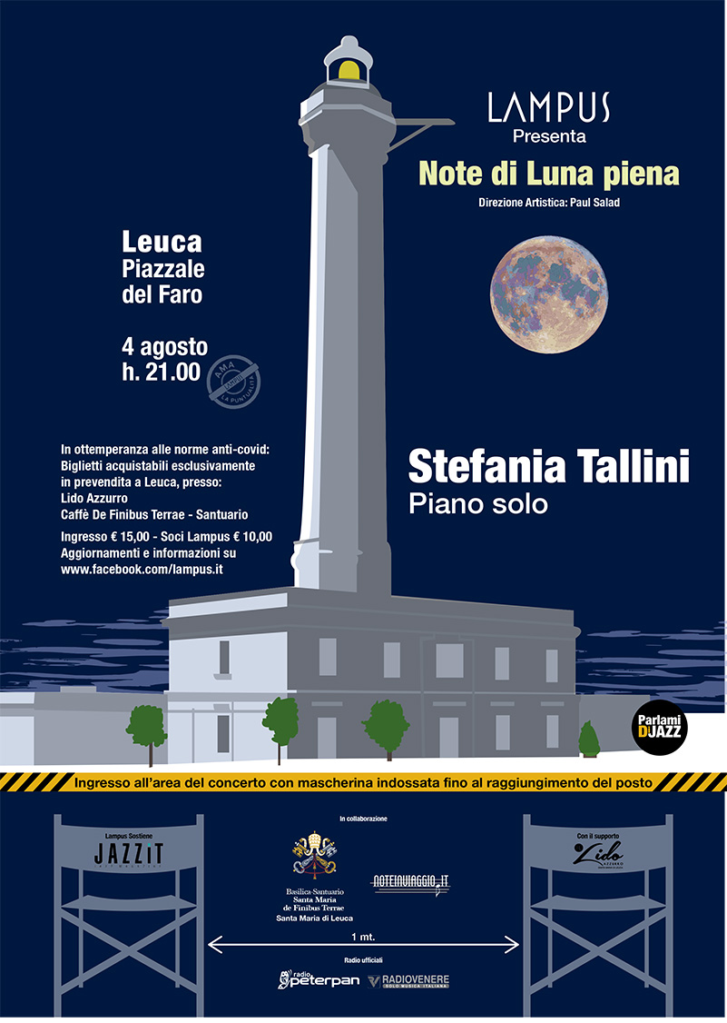 Dopo mesi d’incertezza dovuta alle note vicende sanitarie che attanagliano l’intero pianeta, l’associazione culturale Lampus, operante prevalentemente nel Capo di Leuca, ha deciso, in collaborazione con la Basilica Santuario Santa Maria de Finibus Terrae, di organizzare un concerto-tributo di grande eleganza, dedicato alla luna piena che illuminerà uno scenario magnifico: il piazzale su cui svetta imponente il Faro di Santa Maria di Leuca, ultimo faro del tacco d’Italia e secondo faro italiano per altezza slm.