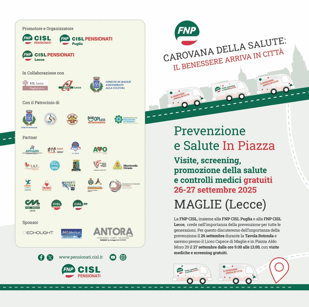 Il Liceo Capece e piazza Aldo Moro a Maglie ospitano la Carovana della Salute, un’iniziativa promossa da FNP CISL nazionale, FNP CISL Puglia e FNP CISL Lecce per promuovere il benessere della persona e la prevenzione nelle nostre comunità.