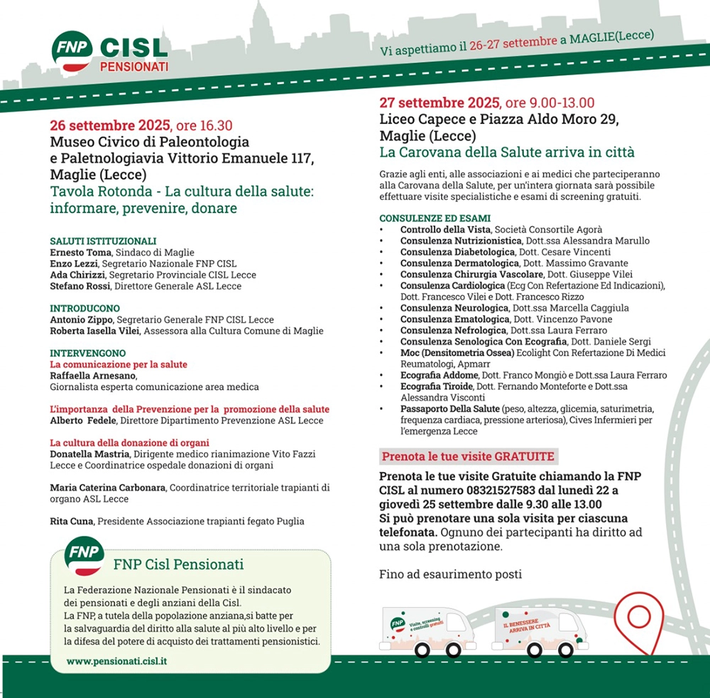 Dopo i saluti istituzionali di Ernesto Toma, sindaco di Maglie, Enzo Lezzi, Segretario Nazionale FNP CISL, Ada Chirizzi, Segretario Provinciale CISL Lecce e Stefano Rossi, Direttore Generale ASL Lecce e le introduzioni di Antonio Zippo, Segretario Generale FNP CISL Lecce e Roberta Iasella Vilei, assessora alla Cultura di Maglie, sono previsti gli interventi di: Raffaella Arnesano (giornalista esperta di  comunicazione in area medica) su La comunicazione per la salute; Alberto Fedele (Direttore Dipartimento Prevenzione Asl Lecce) su L’importanza della prevenzione per la promozione della salute; Donatella Mastria (dirigente medico nel Reparto di Rianimazione del P.O. ‘Vito Fazzi’ di Lecce e coordinatrice ospedale per la donazione di organi); Maria Caterina Carbonara (coordinatrice territoriale trapianti di organo ASL Lecce) e Rita Cuna (presidente Associazione per i trapianti di fegato in Puglia) su La cultura della donazione di organi.