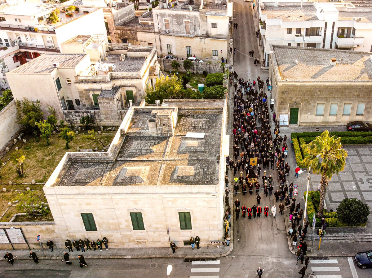 Il corteo raggiunge il Cristo morto presso la Chiesa Madre e, da lì, la processione riparte percorrendo le vie della città.