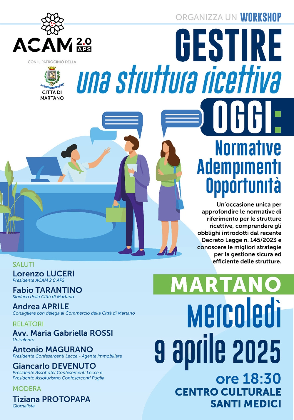 ACAM 2.0 APS, con il patrocinio del Comune di Martano, organizza un importante workshop dedicato a proprietari, gestori e operatori del settore ricettivo, per approfondire il quadro normativo e operativo delle strutture turistiche nel 2025.