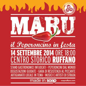 Dopo lo straordinario successo della prima edizione, l’associazione Made in Soap ripropone l’appuntamento più piccante dell’estate salentina: “Maru”, Il peperoncino in festa. Domenica 14 settembre, dalle 18, nella splendida cornice del centro storico di Ruffano, sarà il rosso del peperoncino, del “Re” dell’arte culinaria salentina, a farla da padrone.