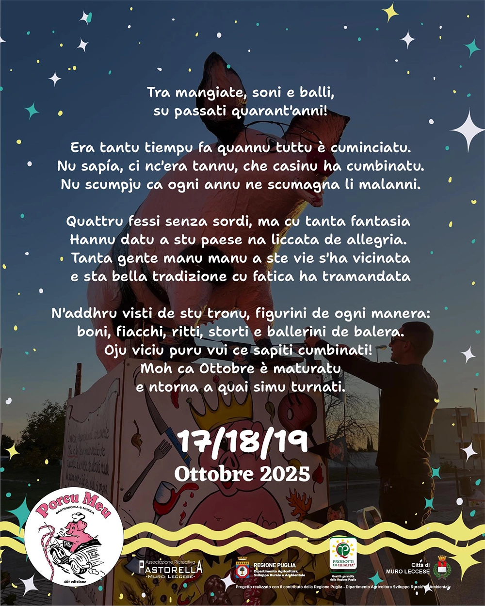 Muro Leccese si prepara, dunque, a celebrare la 40ª edizione della Festa del “Porcu Meu”, un evento che da quattro decenni unisce gusto, musica e tradizione. Dal 17 al 19 ottobre, il paese si trasformerà in un palcoscenico di emozioni, con un programma ricco di iniziative che coinvolgeranno residenti, visitatori e appassionati della cultura locale.