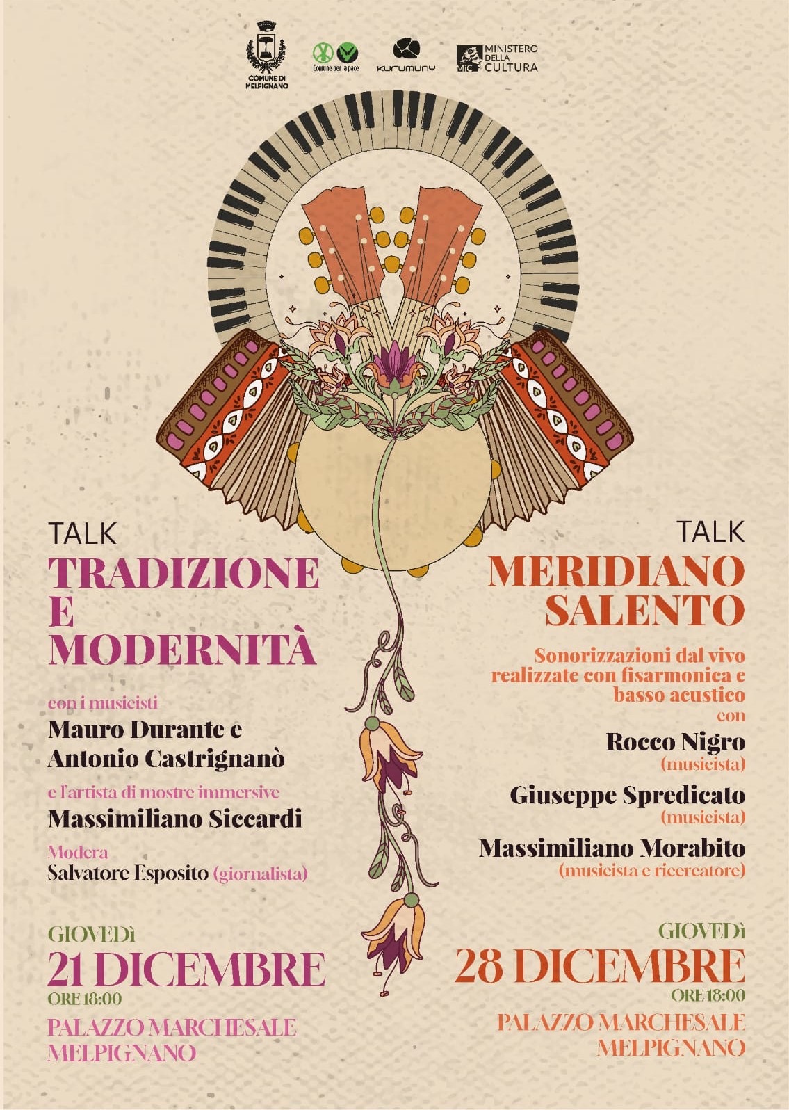 Giovedì 21 dicembre alle ore 18, nel Palazzo Marchesale di Melpignano, ci sarà il talk “Tradizione e Modernità”; il 28 dicembre l’incontro “Meridiano Salento”