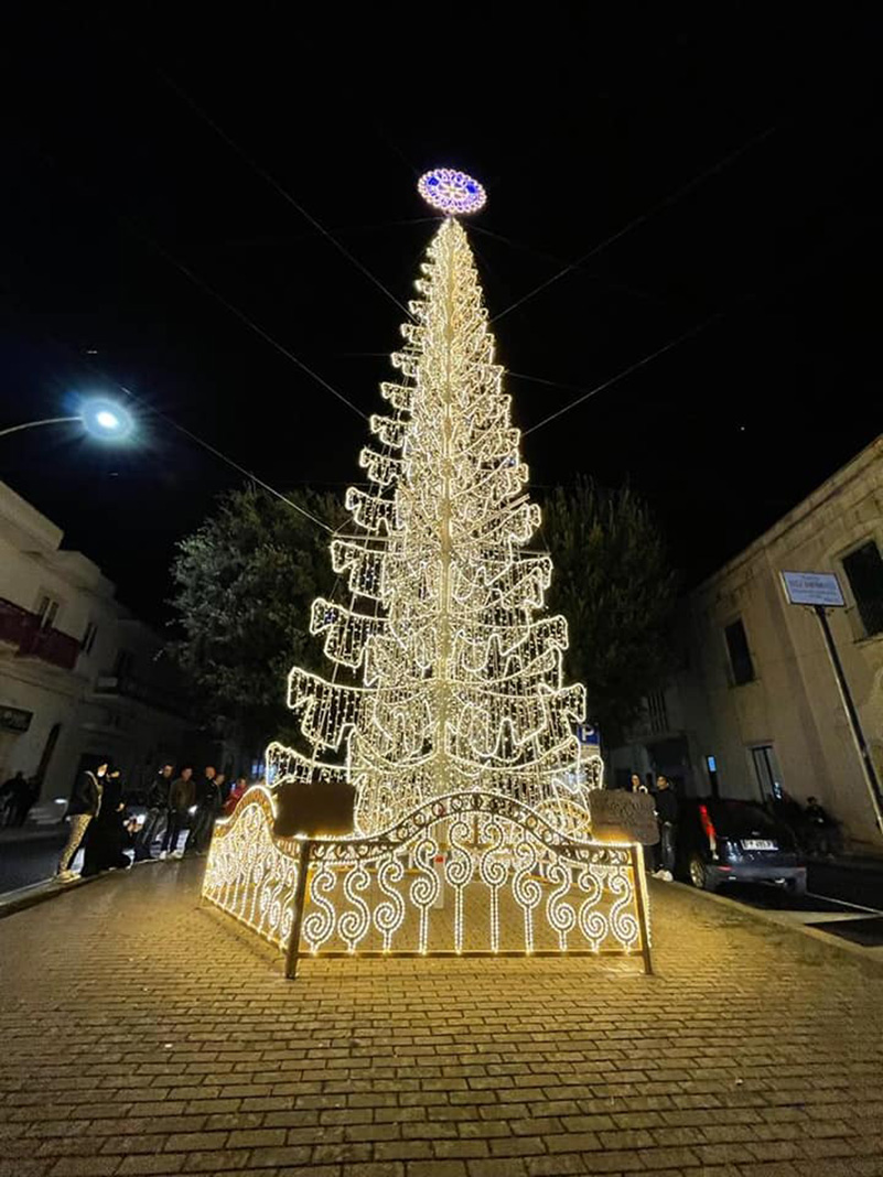 Alle ore 22 è prevista l’accensione delle luminarie natalizie, su un progetto di Lumiworks srl di Lecce, di fatto un “abito” che la città indossa in occasione del periodo natalizio.