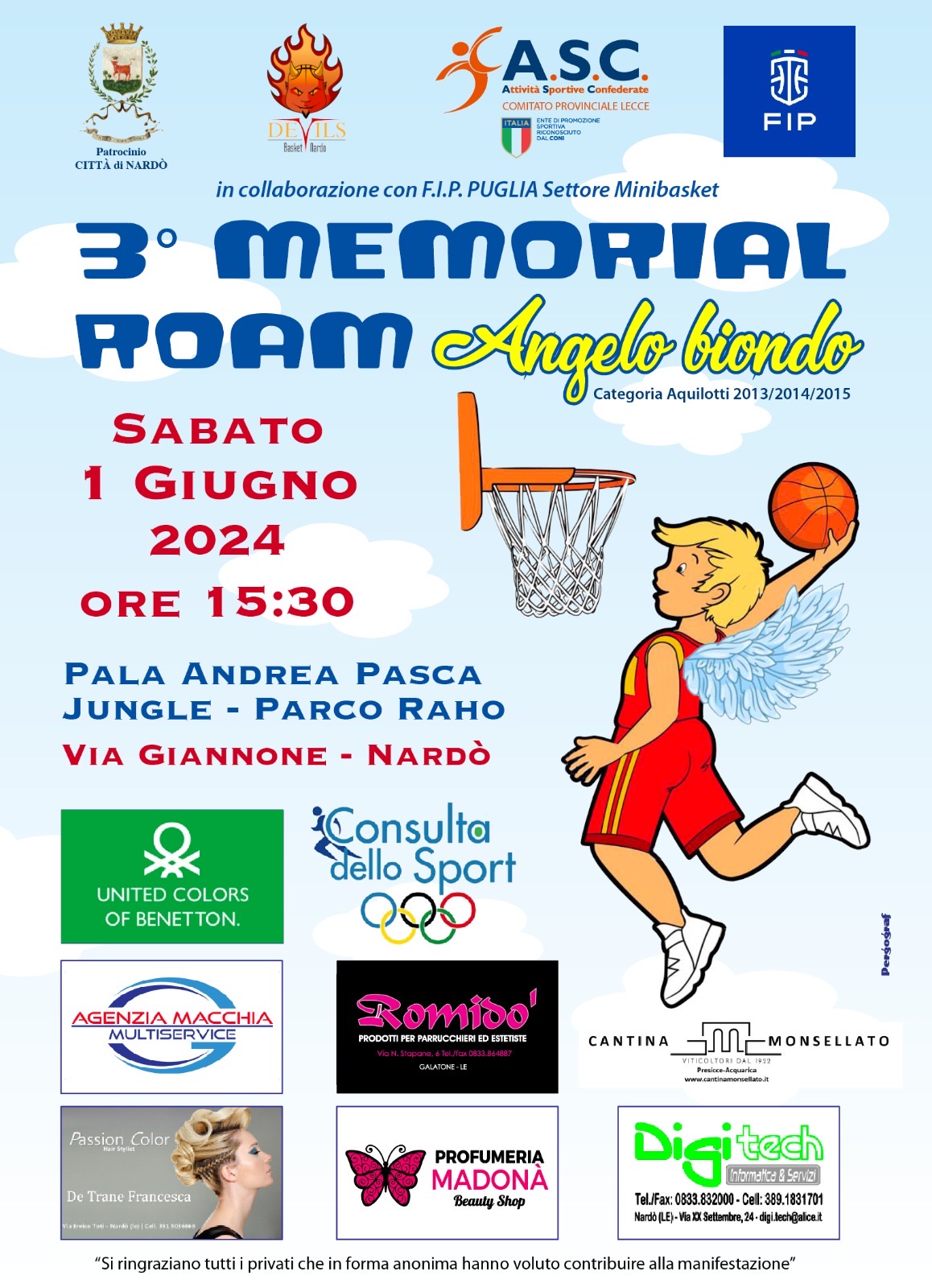 Domani, sabato 1° giugno, alle ore 15,30, le porte del Pala “Andrea Pasca” si apriranno per il 3º Memorial ROAM “Angelo Biondo”, organizzato dall’ASD Devils Basket Nardò, con la collaborazione del comitato provinciale ASC di Lecce, la FIP Puglia settore minibasket, il Comune di Nardò nella figura del Presidente del Consiglio Comunale con delega allo Sport, Antonio Tondo, e della Consulta dello Sport.