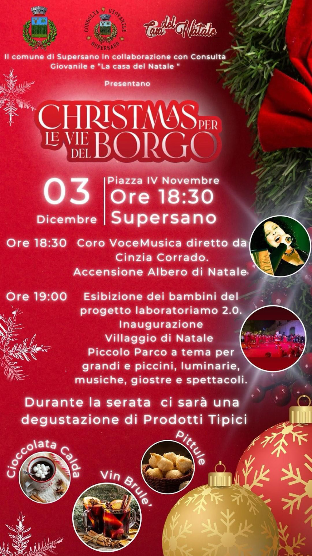 A Supersano si festeggia nel Borgo su iniziativa dell’amministrazione comunale in collaborazione con la Consulta giovanile e “La Casa del Natale”: domenica 3 dicembre, a partire dalle ore 18,30, ci sarà un momento dedicato all’accensione dell’Albero di Natale realizzato interamente da un gruppo di cittadini che si sono identificati con il nome “La casa del Natale”: un albero che non va raccontato, in quanto la sua bellezza e la sua struttura potranno essere apprezzate solo visivamente, non essendoci parole per descriverlo.