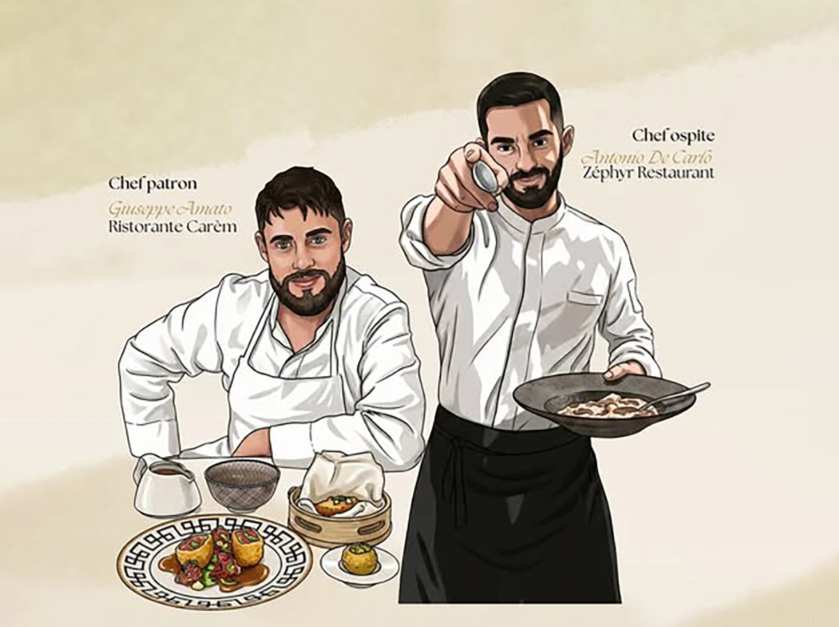 Giuseppe Amato, padrone di casa e cuore pulsante di Carem, accoglie Antonio De Carlo, raffinata voce culinaria di Zéphyr Restaurant di Lecce (lafiermontinacollection.com) per un dialogo che unisce la lucidità della tecnica a un sentire profondamente umano, fatto di memorie da proteggere e nuove vie da percorrere.