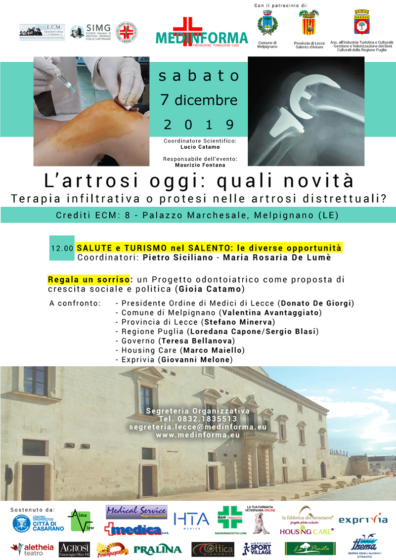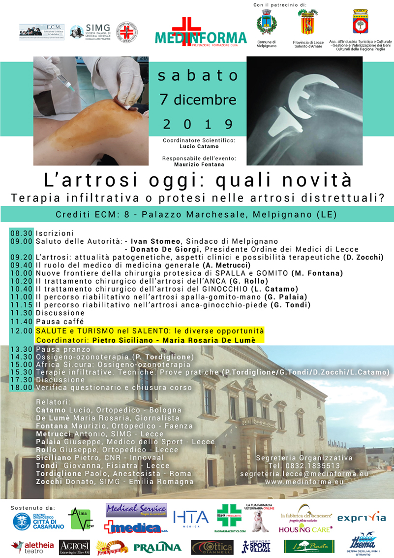 Il convegno “Terapia o protesi nelle artrosi distrettuali?”, promosso da Medinforma in collaborazione con SIMG – Società Italiana di Medicina Generale e delle Cure Primarie, con il patrociniol dell’Ordine dei Medici Chirurghi e Odontoiatri di Lecce, Comune di Melpignano, Provincia di Lecce – Salento d’Amare, dell’Assessore all’Industria Turistica e Culturale – Gestione e Valorizzazione dei Beni Culturali della Regione Puglia, riunirà sabato 7 dicembre al Palazzo Marchesale di Melpignano specialisti delle più importanti stutture sanitarie italiane. Al centro dei lavori l’artrosi, fra le malattie croniche più frequenti nella popolazione italiana e principale causa di disabilità dell’anziano in Puglia.
