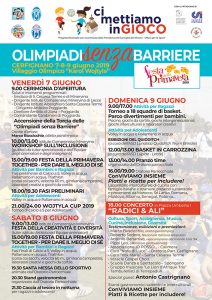 Dalle 15 alle 19, “Festa della Primavera 2019 Together – Per dare il meglio di sé”, con le fasi preliminari per bambini e ragazzi per Calcio a 5, Volley in acqua, Pallamano in acqua, triathon (vortex, velocità 60 metri, gimkana campestre), laboratori creativi e giochi da cortile.