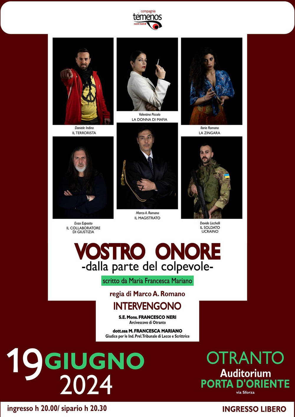 Anche quest’anno la Compagnia Témenos Recinti Teatrali, sempre in prima linea su questo tema, vuole dare il proprio contributo, ovviamente nel proprio campo, con uno spettacolo teatrale, alla lotta alle mafie.