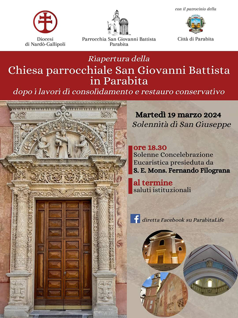 «Sarà una giornata davvero storica per la nostra comunità parrocchiale quest’anno il 19 marzo, festa di San Giuseppe, Sposo della B.V. Maria: alle ore 18,30, il nostro Vescovo Fernando Filograna presiederà la Celebrazione Eucaristica per la riapertura della Chiesa intitolata a San Giovanni Battista».