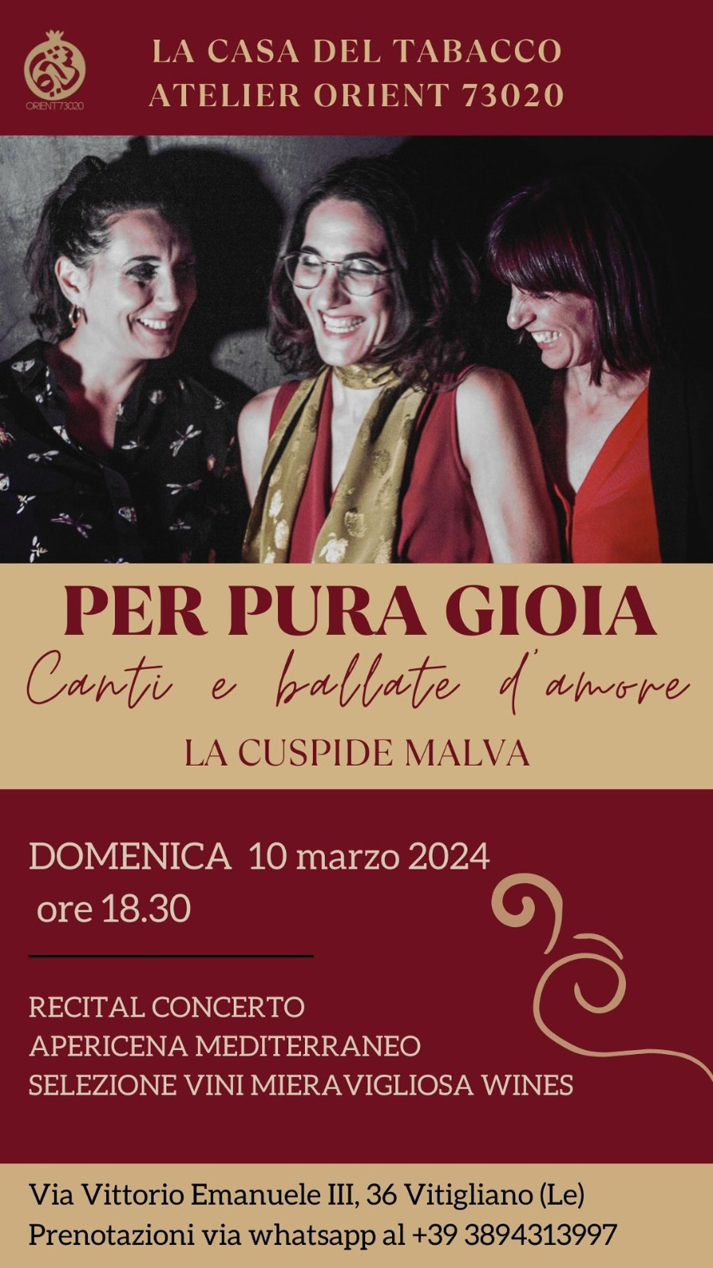 “Per pura gioia. Canti e ballate d’amore” è un progetto di ricerca sonora e poetica a cura de La Cuspide Malva, formazione in trio con Iula A. Marzulli, Manuela Mastria e Adriana Polo.