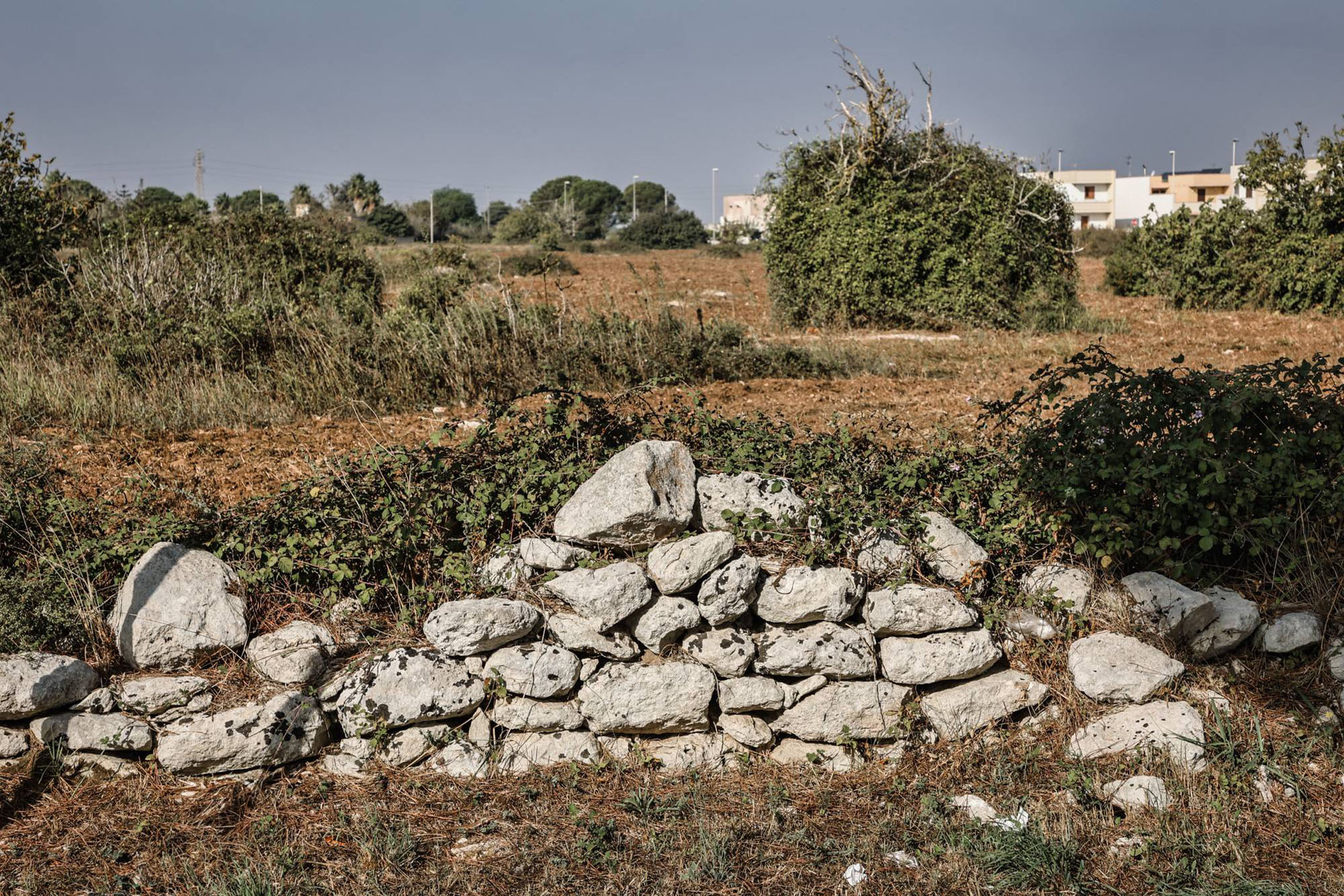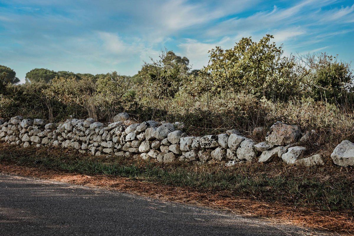 Immersi nel caratteristico paesaggio agrario lungo sentieri racchiusi tra i muretti a secco, mentre l’odore di erba pervade le narici e antichissimi menhir sorvegliano il cammino. Si ammirano le cave silenziose, memori di giornate di lavoro sudate, di pietra lavorata per secoli solo “cu lu zoccu” (piccone) in maniera imperfetta eppur unica, mentre una masseria si staglia pittoresca sullo sfondo.