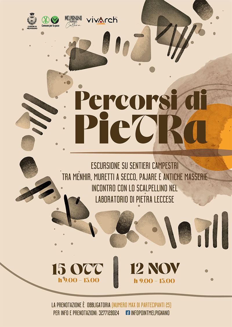 Per la sua quarta proposta ad alto tasso emozionale “Percorsi di Pietra a Melpignano”, dopo il successo delle precedenti, riparte dalla pietra, con un trekking lungo sentieri meno noti. Centrale la riscoperta dell’antica fonte primaria della zona, quando l’estrazione era l’attività principale della gente del posto, celebrandone i paesaggi e i diversi utilizzi in ambito costruttivo e decorativo.