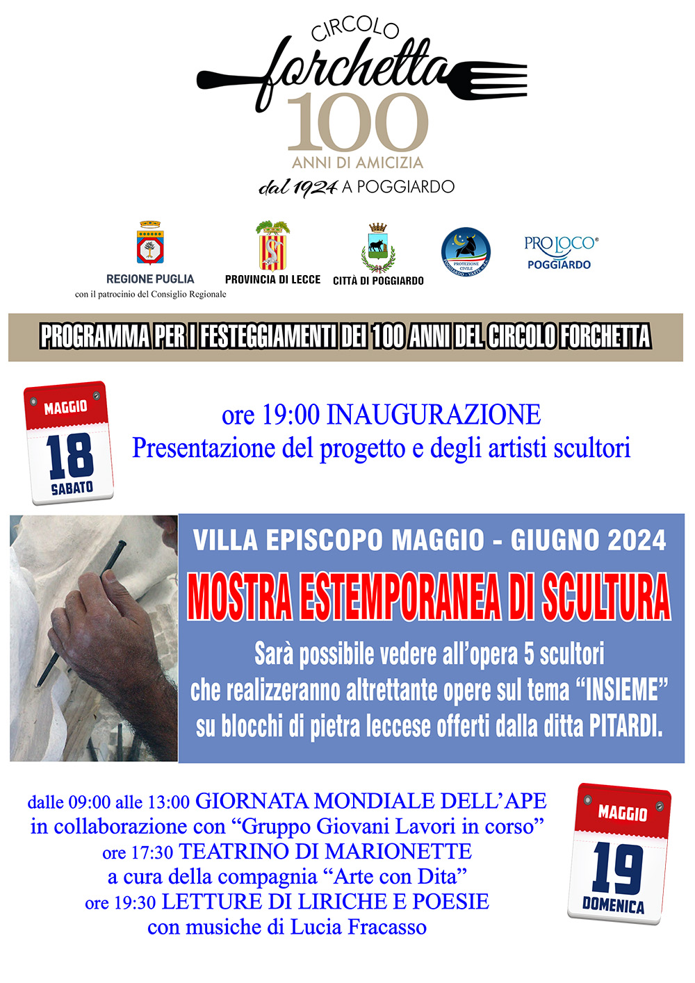 Il primo evento inizierà il sabato 18 maggio (fino al 2 giugno), nella splendida cornice di Villa Episcopo, dove cinque scultori cominceranno la realizzazione di altrettante sculture in pietra leccese che il Circolo Forchetta donerà al comune di Poggiardo per l’arredo urbano della Ccittà.