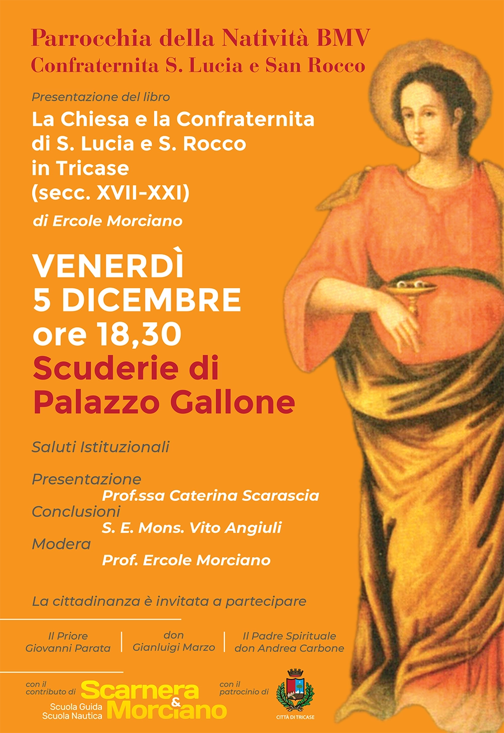 Le Scuderie di Palazzo Gallone ospiteranno la presentazione del libro “La Chiesa e la Confraternita di S. Lucia e S. Rocco in Tricase (Secc. XVII – XXI)” di Ercole Morciano.