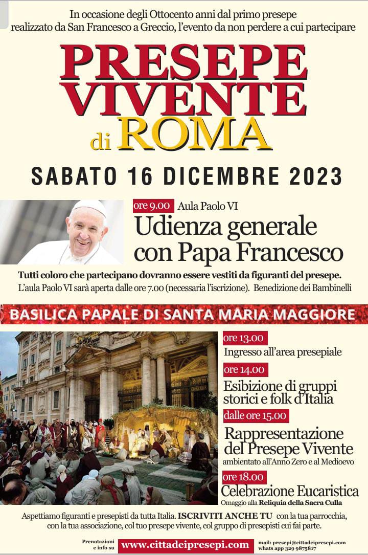 La prima, in ordine di tempo, è il Cartolina Challenge che coinvolge le scuole di ogni ordine e grado del territorio; la seconda è che una nutrita rappresentanza dei figuranti del Presepe Vivente, il prossimo 16 dicembre, porterà la magia di Monte Orco e della Betlemme d’Italia alla corte di Papa Francesco a Roma.