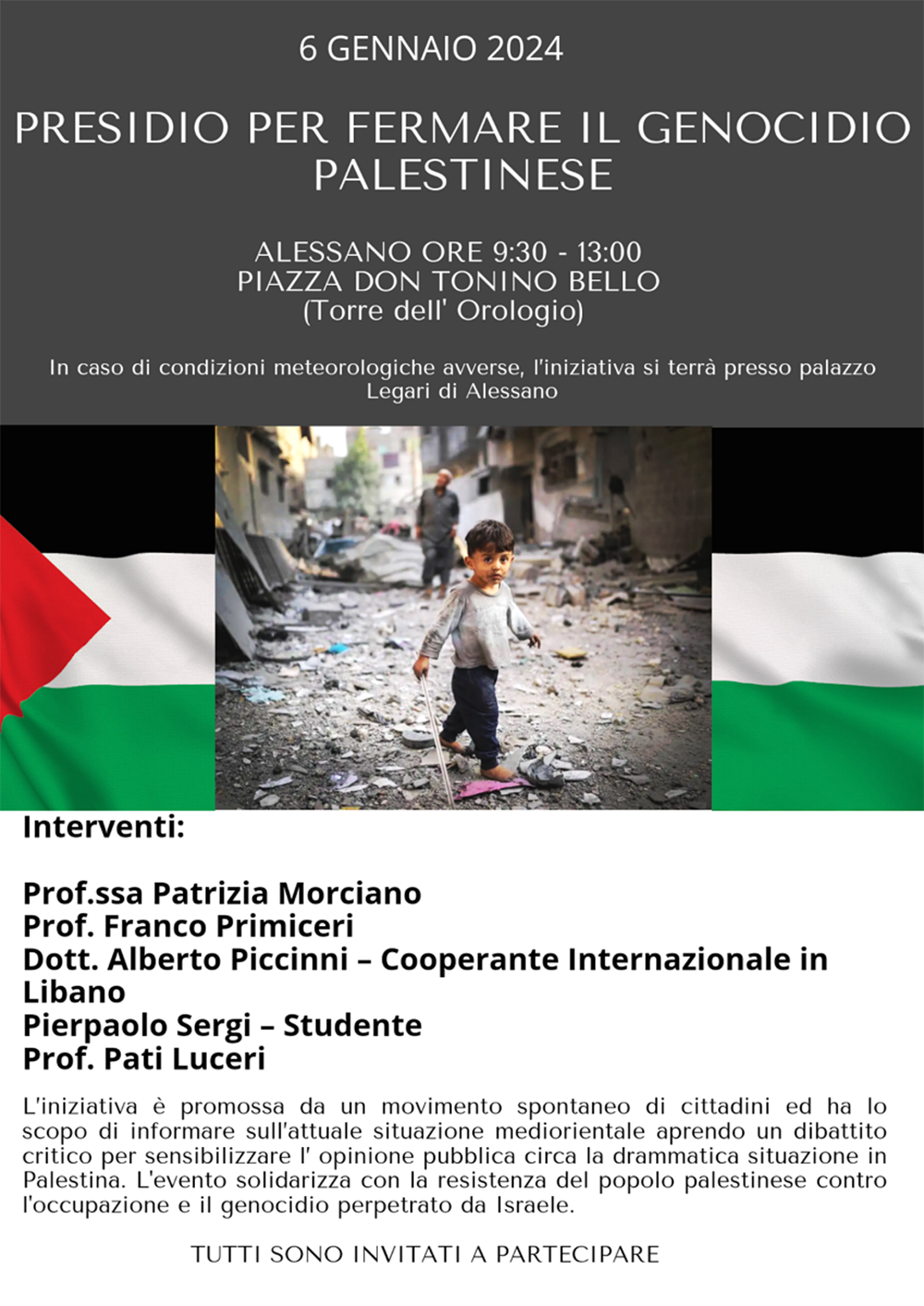 Ad Alessano il Presidio per sensibilizzare l’opinione pubblica su quanto sta accadendo in Palestina si terrà sabato 6 gennaio, dalle ore 9,30 alle 13, in piazza don Tonino Bello (Torre dell’Orologio).