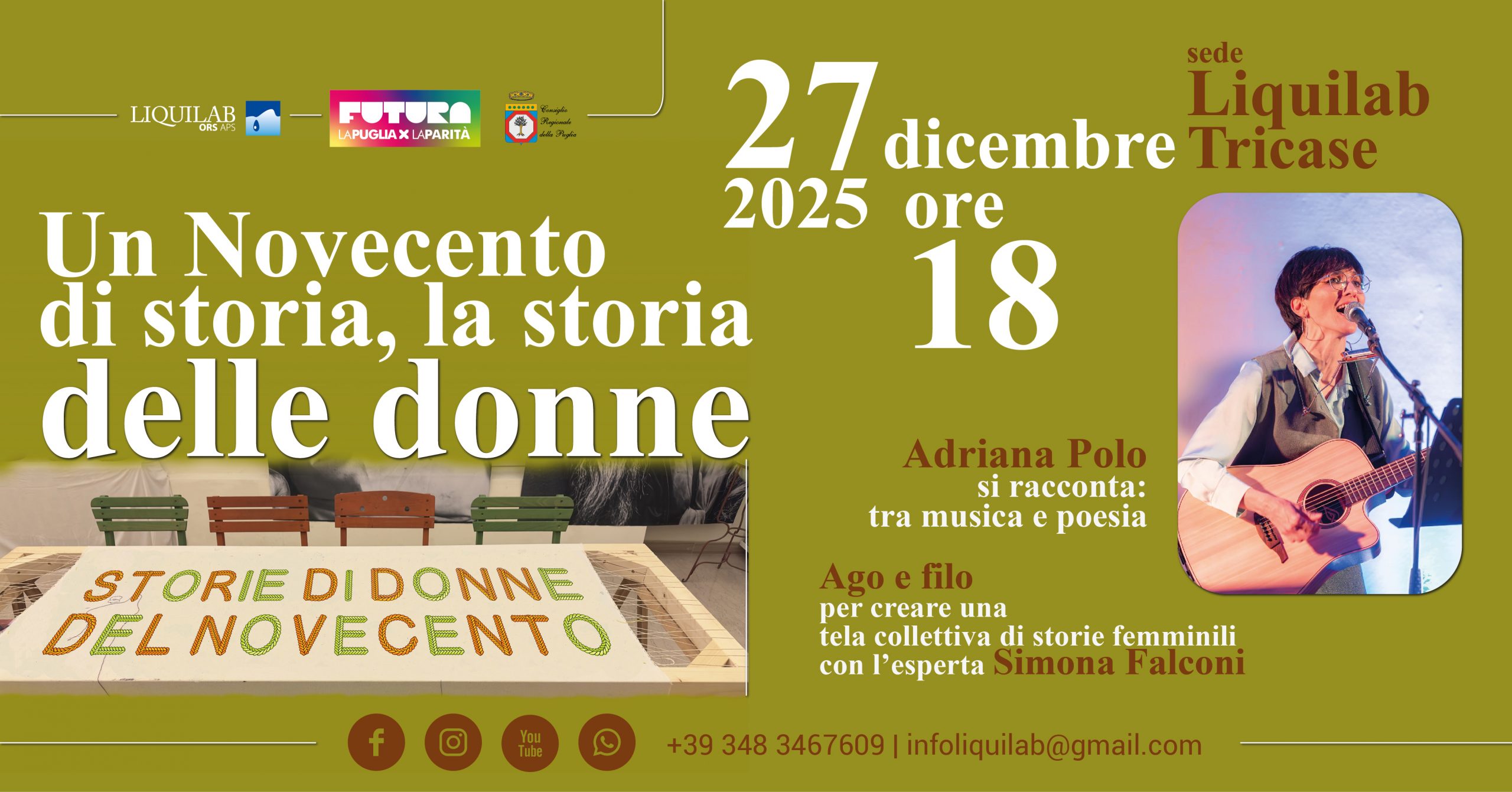 Sabato 27 dicembre 2025 alle ore 18.00 presso la sede di Liquilab nell’ex Convento dei Domenicani in Piazza Dell’Abate a Tricase si terrà l’ultimo incontro del progetto “Storie di donne del ’900”: un percorso di incontri, scambi e racconti tra donne di diversa età, estrazione ed esperienze, da cui è emerso un racconto corale che invita a riflettere sulla condizione della donna lungo il corso del ‘900 fino ad oggi.