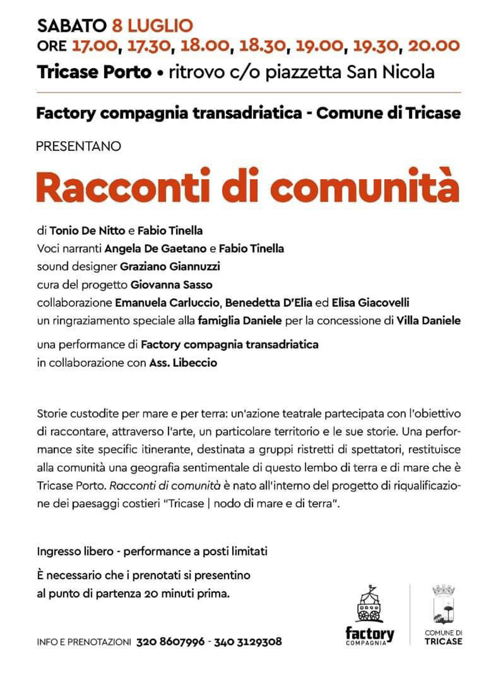Compagnia Transadriatica e Comune di Tricase presentano Racconti di Comunità, storie custodite per mare e per terra: un’azione teatrale partecipata con l’obiettivo di raccontare, attraverso l’arte, un particolare territorio e le sue storie.
