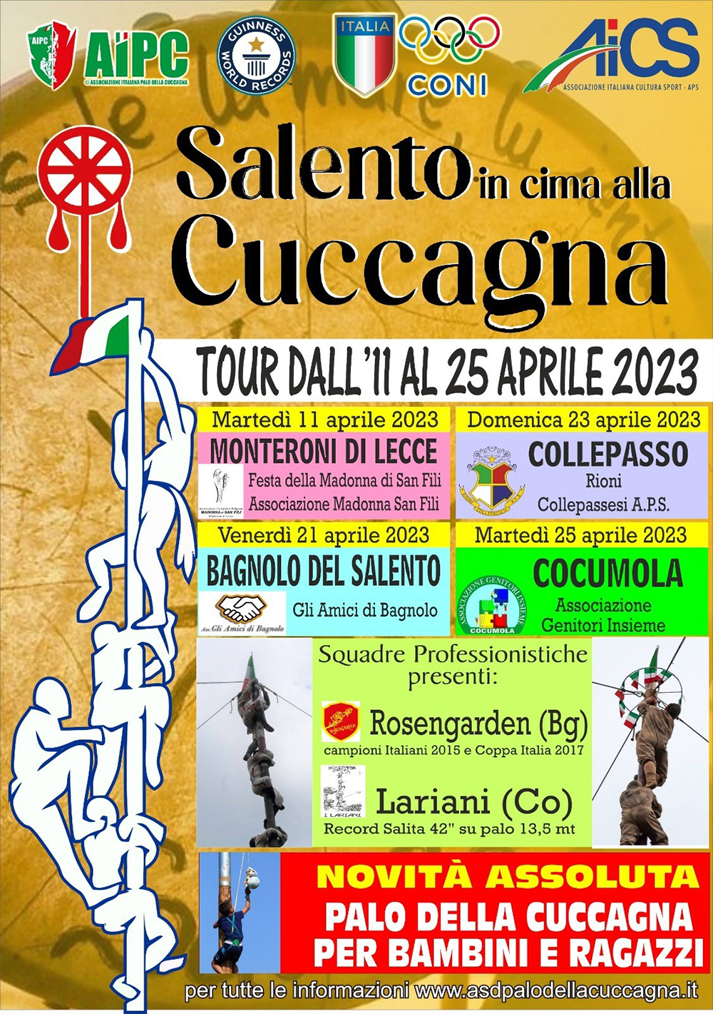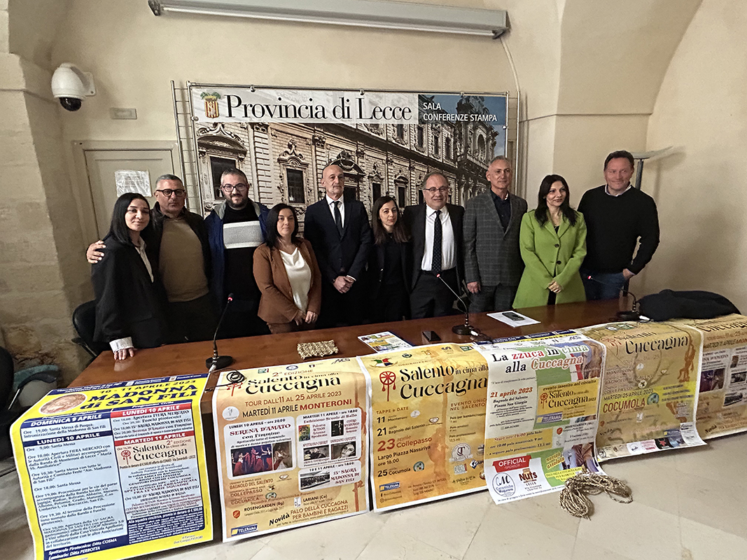 Dilettanti, professionisti e, novità di quest’anno, anche bambini e ragazzi, si sfideranno, in quattro Comuni salentini, per conquistare la vetta più alta. Da oggi e fino al 25 aprile, torna “Salento in Cima alla Cuccagna”, manifestazione organizzata dalle associazioni “Madonna di San Fili” di Monteroni di Lecce, “Gli Amici di Bagnolo” di Bagnolo del Salento, “Rioni Collepassesi A.P.S.” di Collepasso e “Genitori Insieme” di Cocumola, con il patrocinio della Provincia di Lecce.