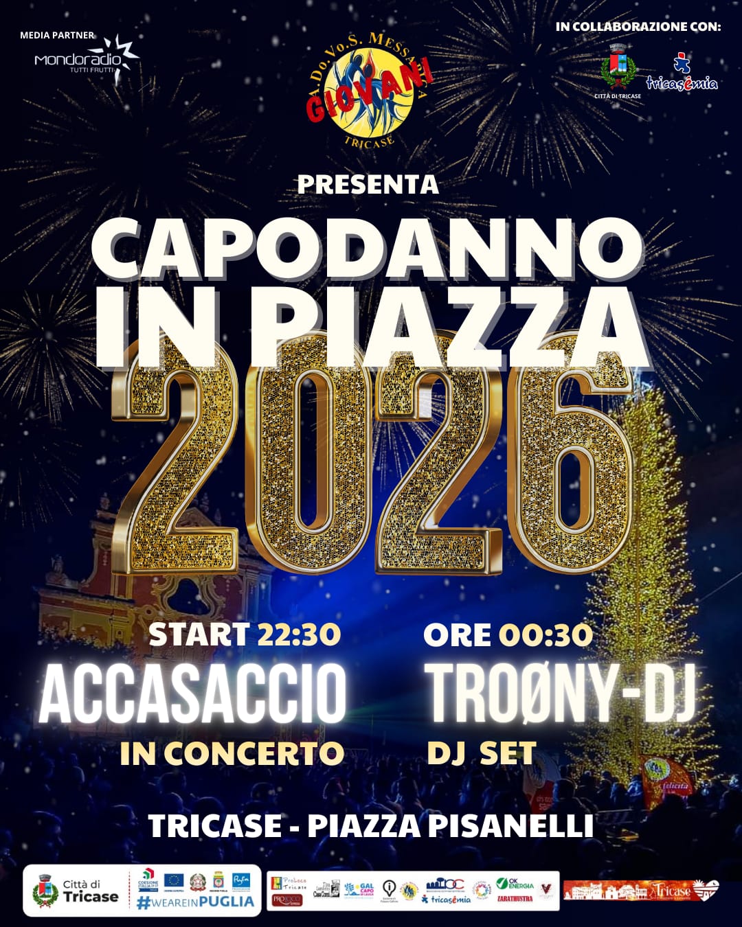 Sul palco dalle ore 22:30 la band ACCASACCIO farà scatenare la piazza, e a seguire, dalle ore 00:30, Troony DJ ci porterà nel cuore del 2026 con il suo dj set.