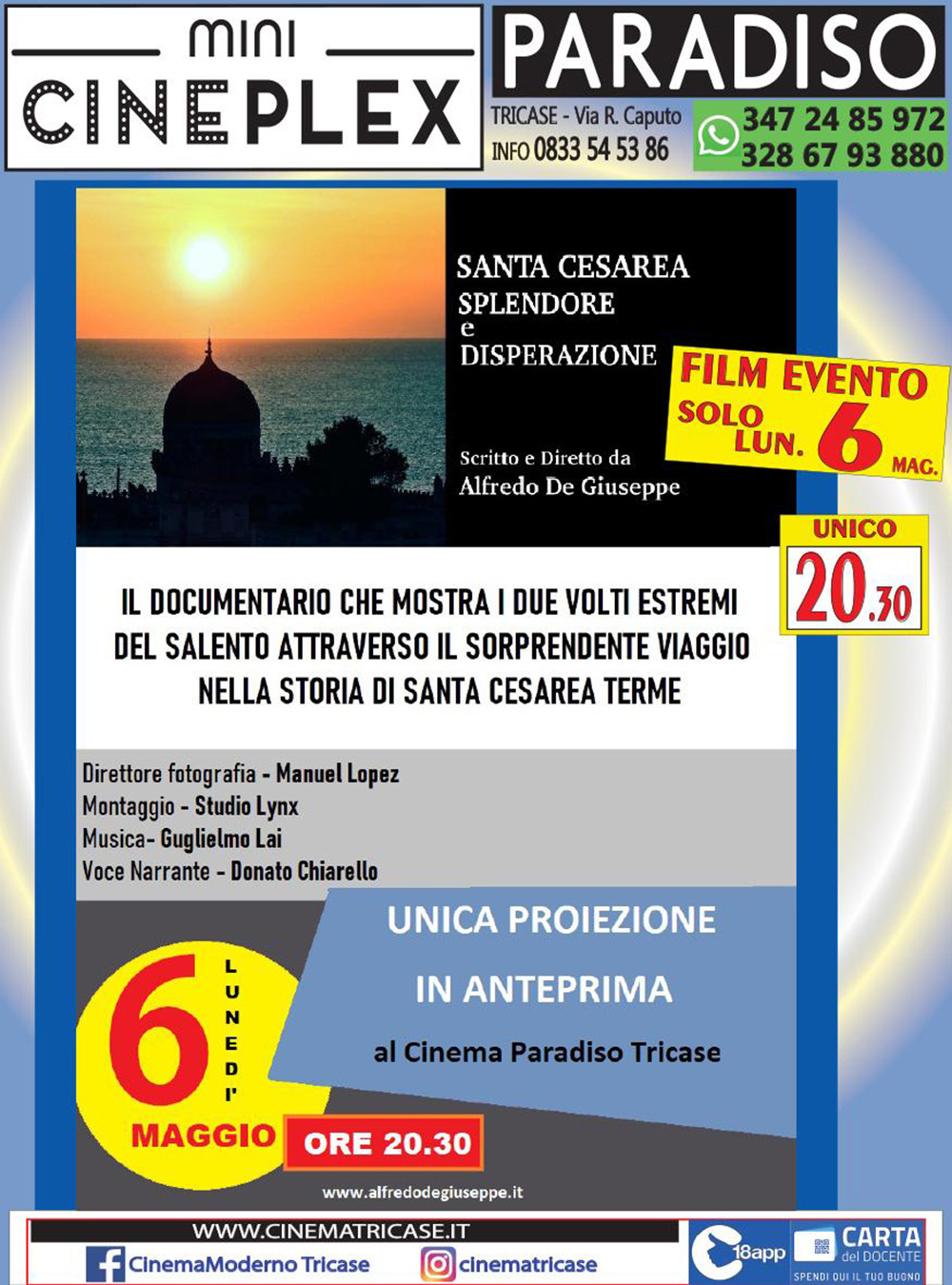 Lunedì 6 maggio, in anteprima assoluta, prima di prendere la strada di importanti festival in Italia e all’estero, sarà proiettato al CinePlex Paradiso di Tricase (proiezione unica ore 20,30).