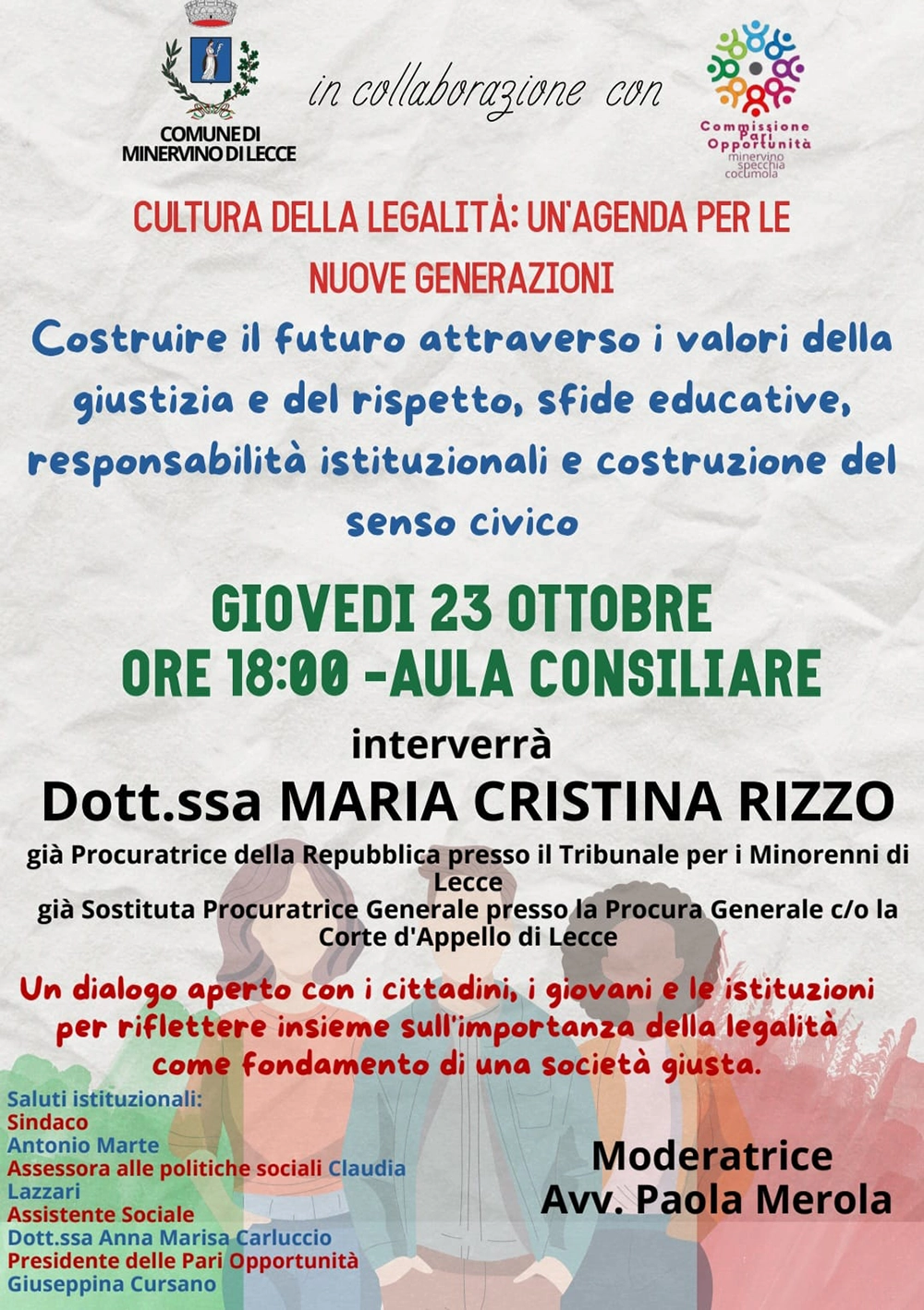 Giovedì 23 ottobre, a partire dalle ore 18, nell’aula consiliare di Minervino di Lecce, si parlerà di “Cultura della legalità: un’agenda per le nuove generazioni».