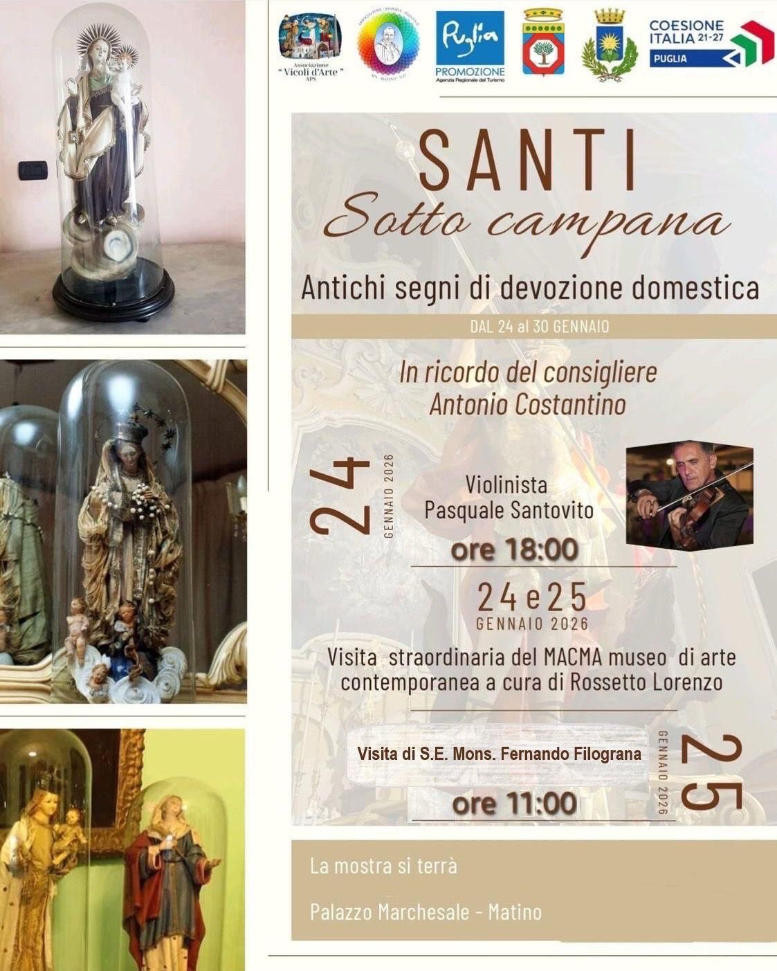 Dal 24 al 30 gennaio il suggestivo Palazzo Marchesale di Matino ospiterà la mostra “Santi Sotto Campana – Antichi segni di devozione domestica”, un’esposizione che celebra gli antichi oggetti di devozione familiare: statue sacre, madonne, santi e bambinelli protetti da campane di vetro, veri e propri tesori di fede trasmessi di generazione in generazione nelle case pugliesi.