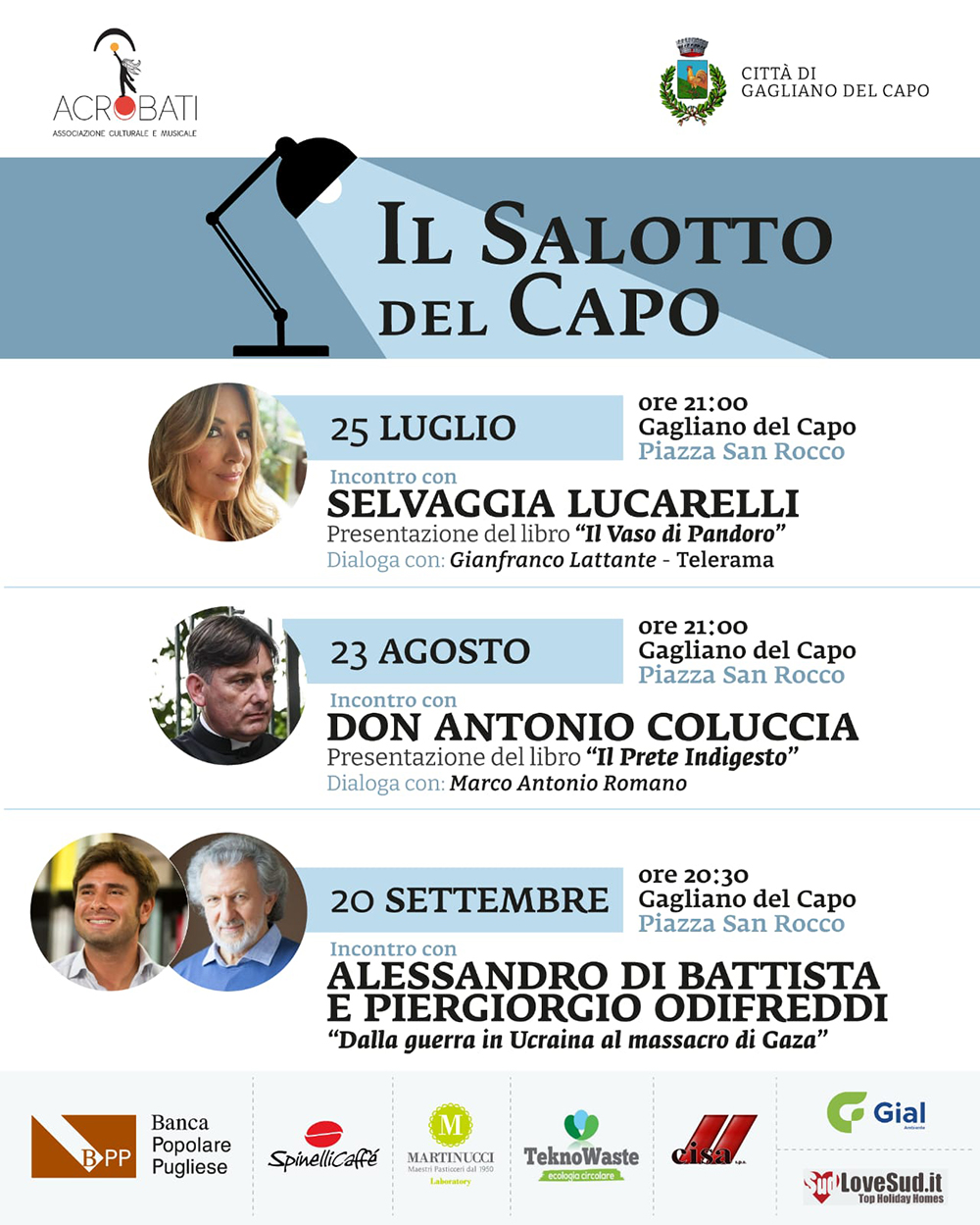 A Gagliano del Capo giovedì 25 luglio presenterà il suo libro “Il vaso di pandoro”. Gli altri ospiti della rassegna: don Antonio Coluccia (23 agosto – “Il prete indigesto”); Alessandro Di Battista e Pier Giorgio Odifreddi (20 settembre – “Dalla guerra in Ucraina al massacro di Gaza”