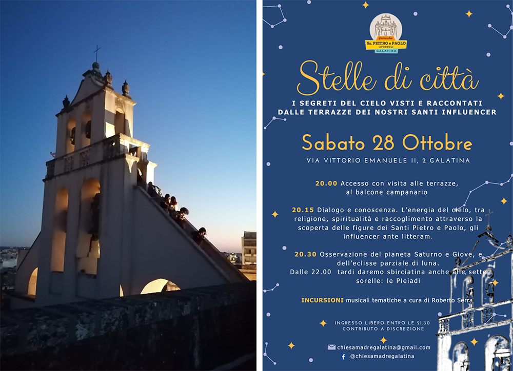 Nel prossimo fine settimana, a partire dalle ore 20, sarà possibile accedere sui tetti e sul balcone campanario, vivendo un momento di intenso raccoglimento e riflessione sulla vita dei Santi Pietro e Paolo, grazie a degli spunti curati da Don Lucio, parroco delle chiesa; osservare le stelle, i pianeti e scoprire i segreti del cielo grazie alla presenza del Gruppo Astrofili del Salento ed immergersi in un’atmosfera di pura magia musicale grazie alla presenza del dj set Roberto Serra, che ha studiato una selezione musicale ispirata proprio al teme delle stelle, della luna e del mondo celeste.