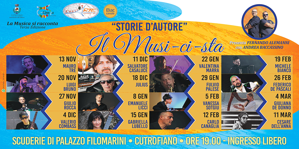 Con il Patrocinio e la collaborazione dell’Amministrazione di Cutrofiano, assessorato alla Cultura, dopo il fortunato esordio avvenuto nella stagione 2019/2020 che ha visto la partecipazione di 12 cantautori salentini provenienti da tutte le estrazioni musicali della nostra realtà territoriale, continuando poi, dopo la pausa covid, con l’edizione 2022/2023 interamente dedicata alle Donne e al loro vastissimo repertorio con 15 bellissimi appuntamenti in Donne d’in… canto, è la volta di mettere al centro dell’attenzione il magico mondo dei musicisti e degli strumenti che accompagnano il loro viaggio musicale con il Musi-Ci-Sta.