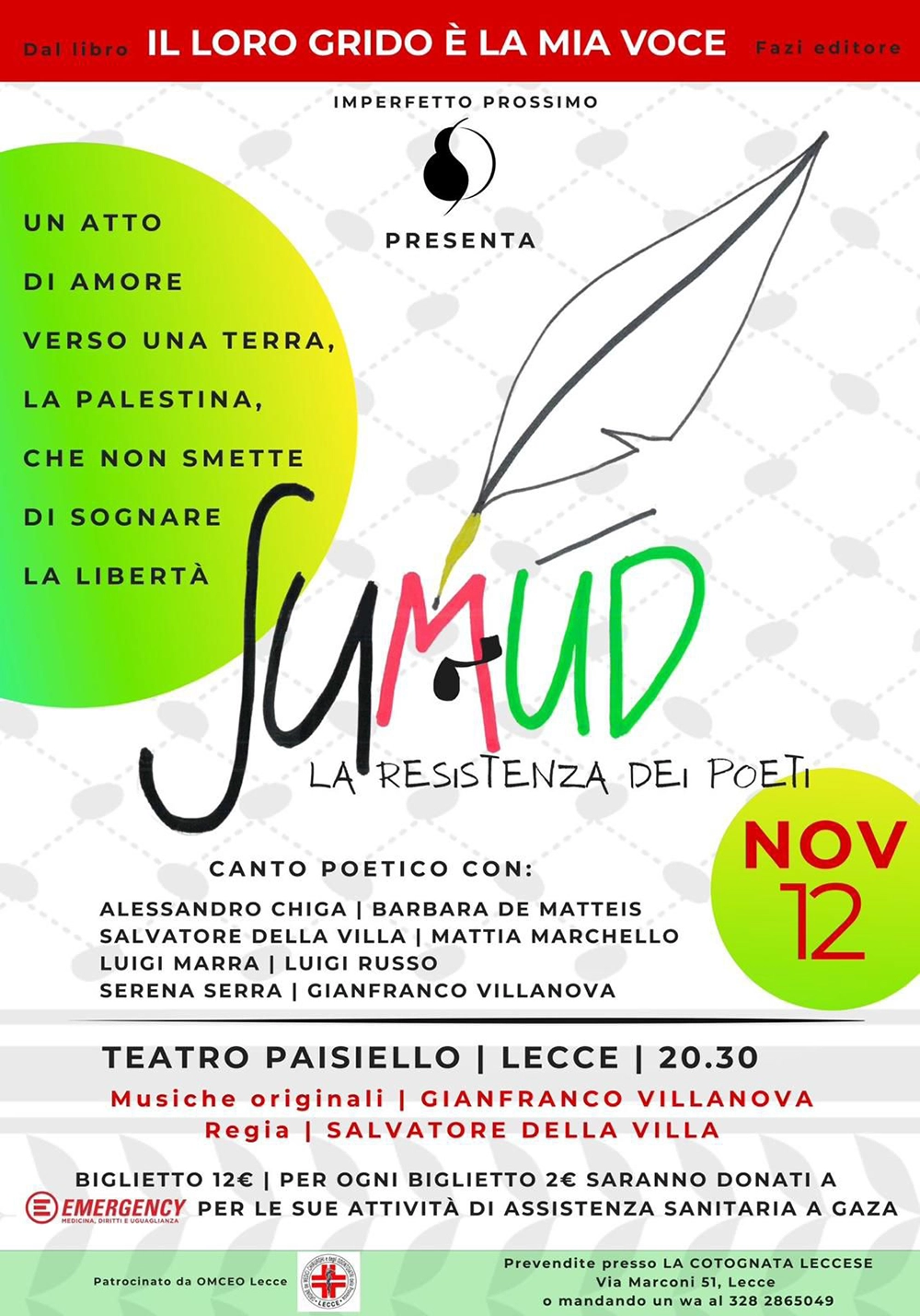Debutta mercoledì 12 novembre al Teatro Paisiello di Lecce (via Giuseppe Palmieri, 83 – ore 20,30) lo spettacolo “Sumūd, la resistenza dei poeti”, tratto dal libro “Il loro grido è la mia voce” (Fazi Editore), una raccolta di poesie scritte da autori palestinesi tra l’ottobre 2023 e il marzo 2025.