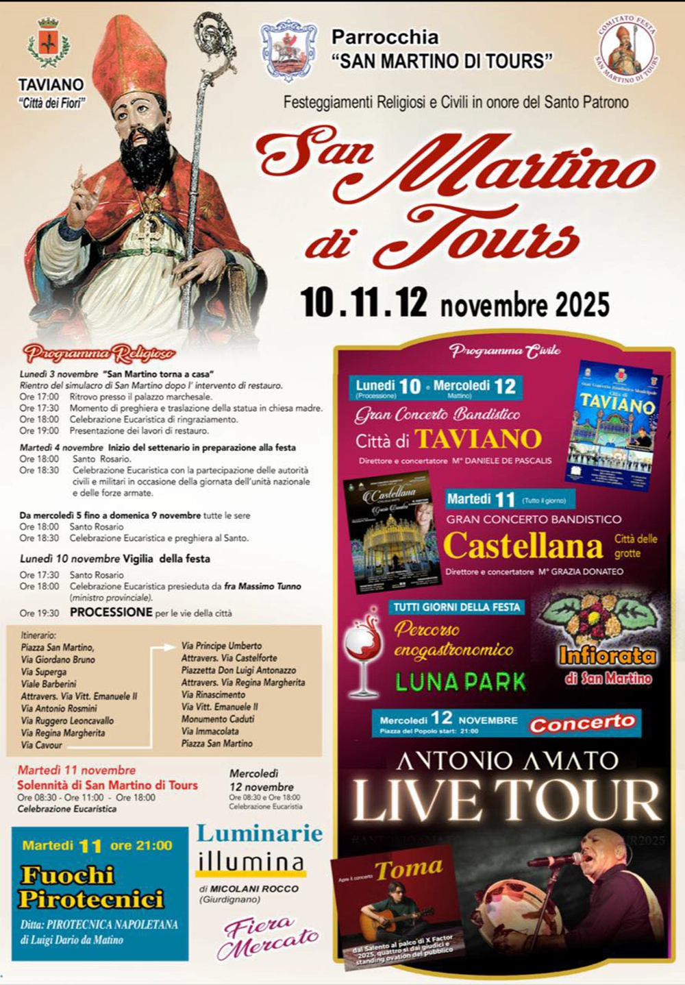Nel suo messaggio alla cittadinanza, il sindaco Francesco Pellegrino ha ricordato il valore profondo di questa festa: «San Martino è il simbolo della condivisione e dell’attenzione verso il prossimo. Il suo gesto ci insegna che ogni volta che tendiamo la mano a chi ha bisogno, rendiamo più forte il legame che tiene viva la nostra comunità. La festa patronale è un’occasione per ritrovarci uniti, come cittadini e come credenti, e per guardare con fiducia al futuro».