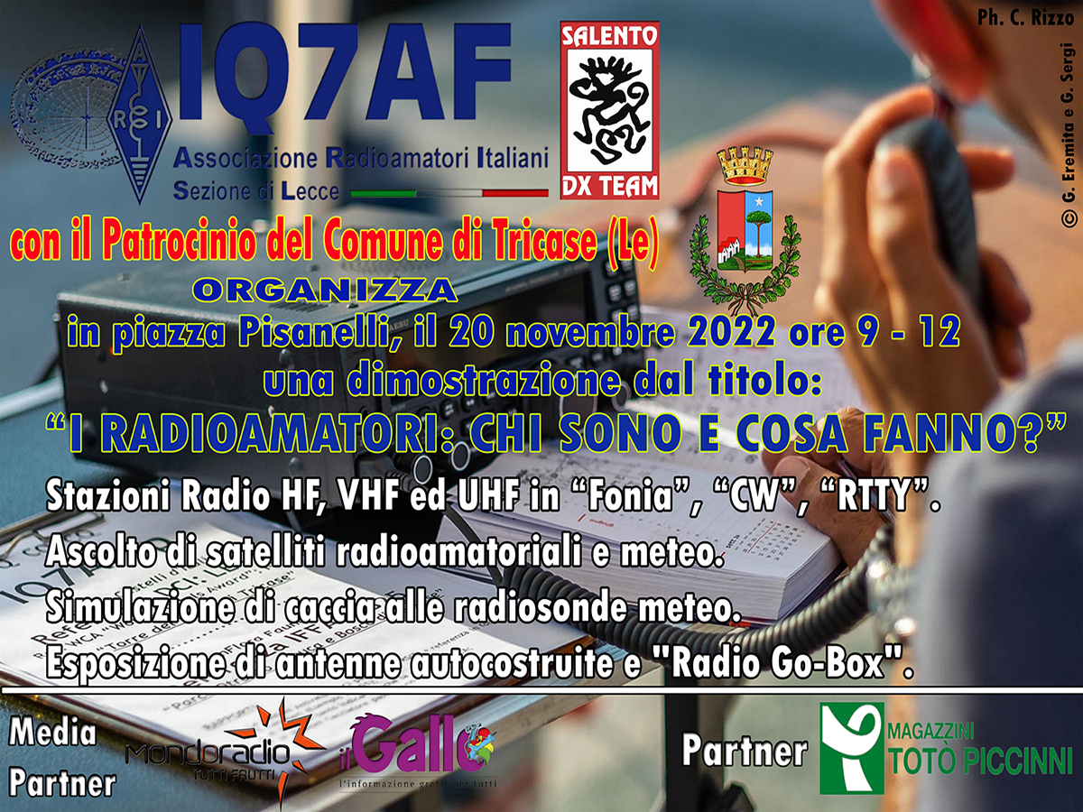 L’iniziativa, promossa dal Gruppo di Tricase di A.R.I. Lecce, e denominata “RadioAmatori: chi sono e cosa fanno?”, consisterà in una dimostrazione volta alla diffusione della conoscenza delle attività e dei compiti svolti dai RadioAmatori.