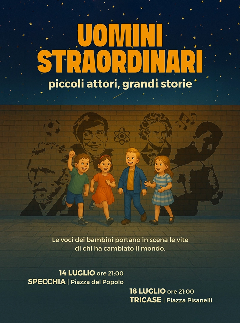 Quella di venerdì 18 luglio (sipario alle 21) sarà una serata dedicata al teatro con “Uomini Straordinari” e Piccoli attori per grandi storie: i bambini portano in scena le vite di chi ha cambiato il mondo.