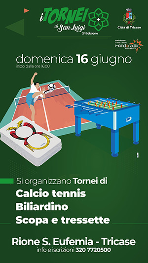 Domenica 16 giugno sono in programma i Tornei di San Luigi: dalle 18, calcio tennis, biliardino, scopa e tressette.