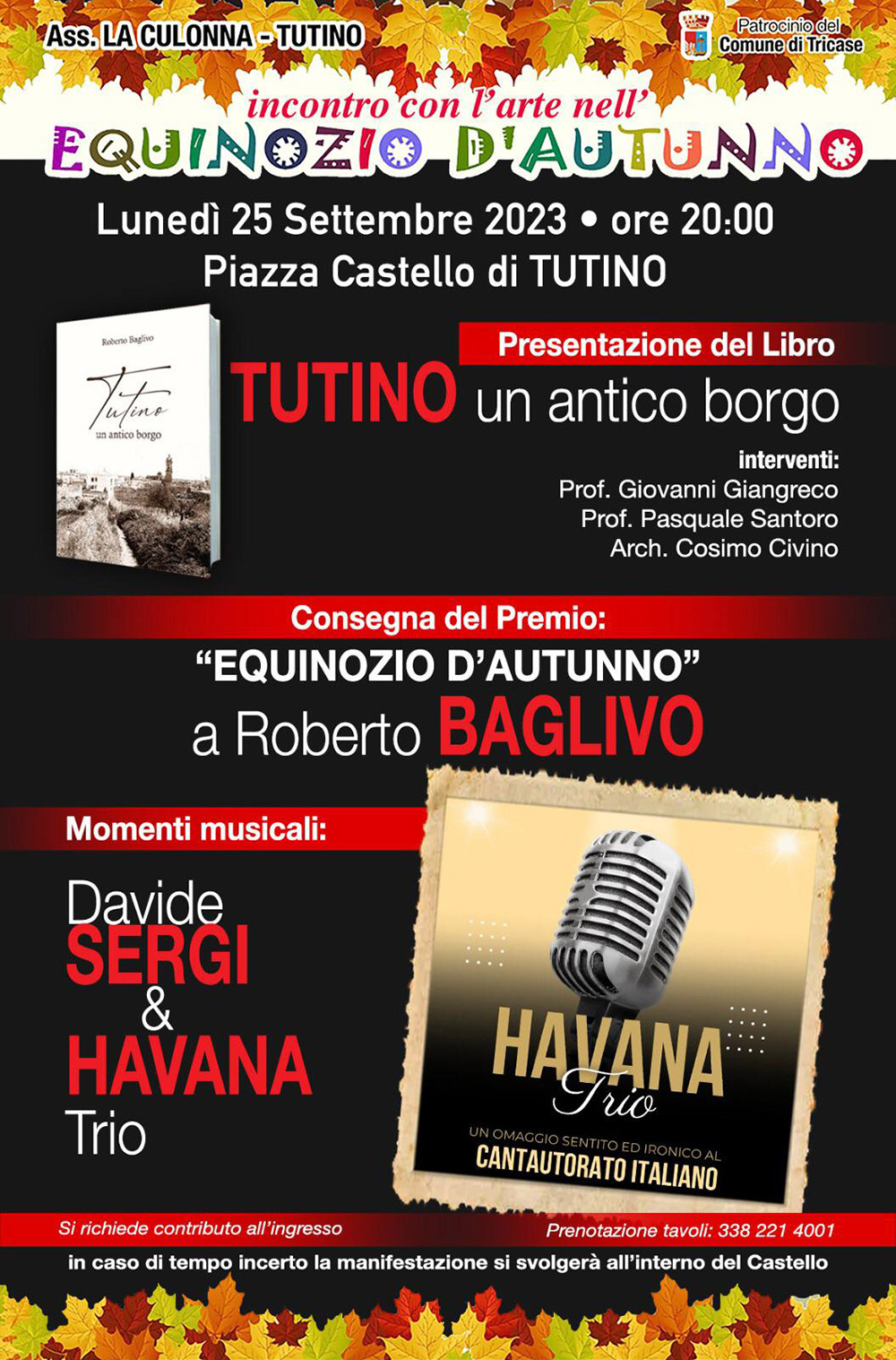 Lunedì 25 settembre a Tutino, dunque, buona musica (Davide Sergi & Havana Trio), la presentazione di “Tutino un antico borgo”, il libro di Roberto Baglivo, che ha dedicato al borgo di Tutino tanta parte dei suoi appassionati studi.