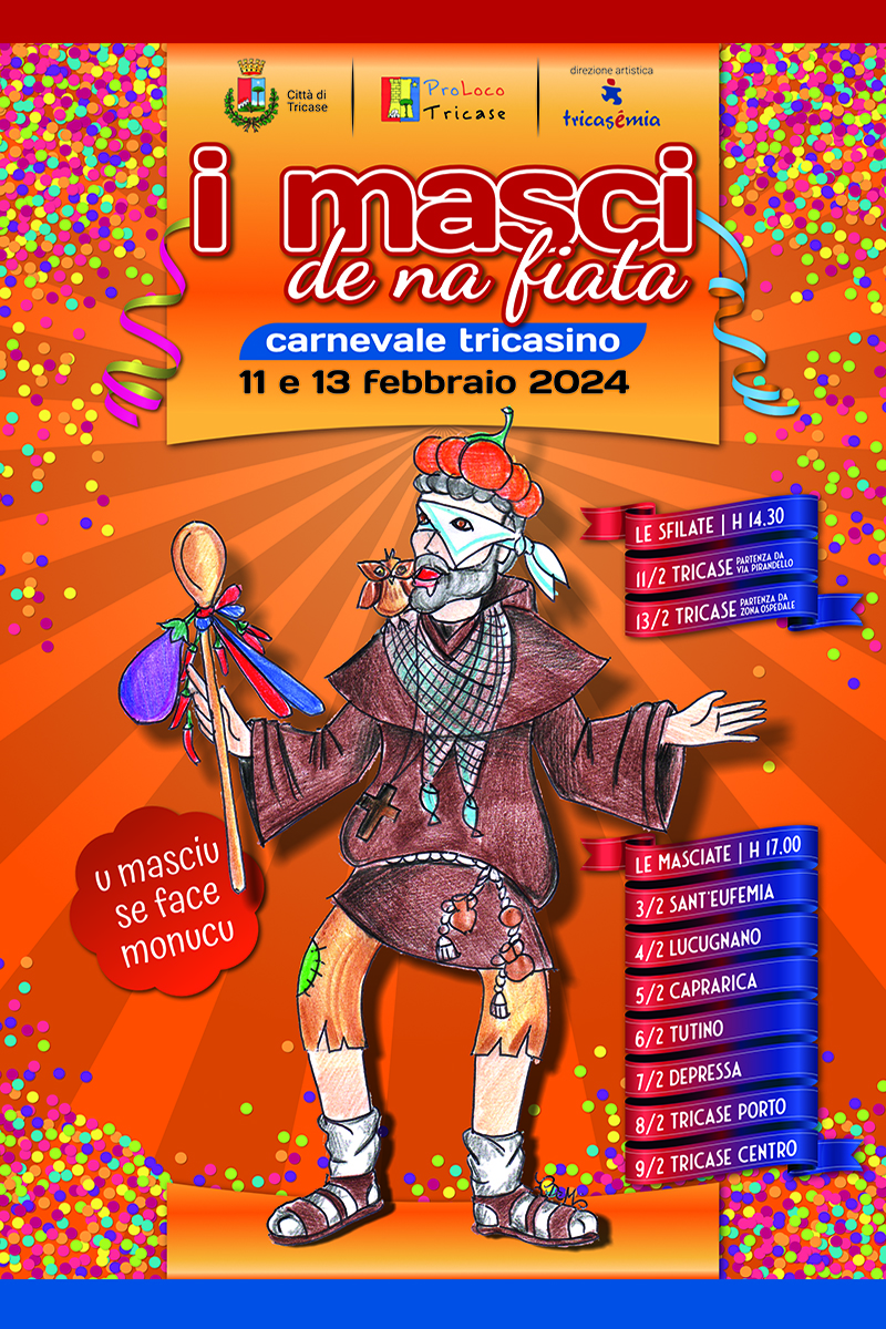 Si rinnova anche nel 2024 l’appuntamento con il Carnevale Tricasino “I Masci de na fiata”, la tradizionale rivisitazione del carnevale che in un tempo passato caratterizzava il territorio di Tricase. L’edizione 2024 è organizzata dall’APS Pro Loco Tricase e dal Comune di Tricase, con la direzione artistica dell’associazione Tricasèmia.