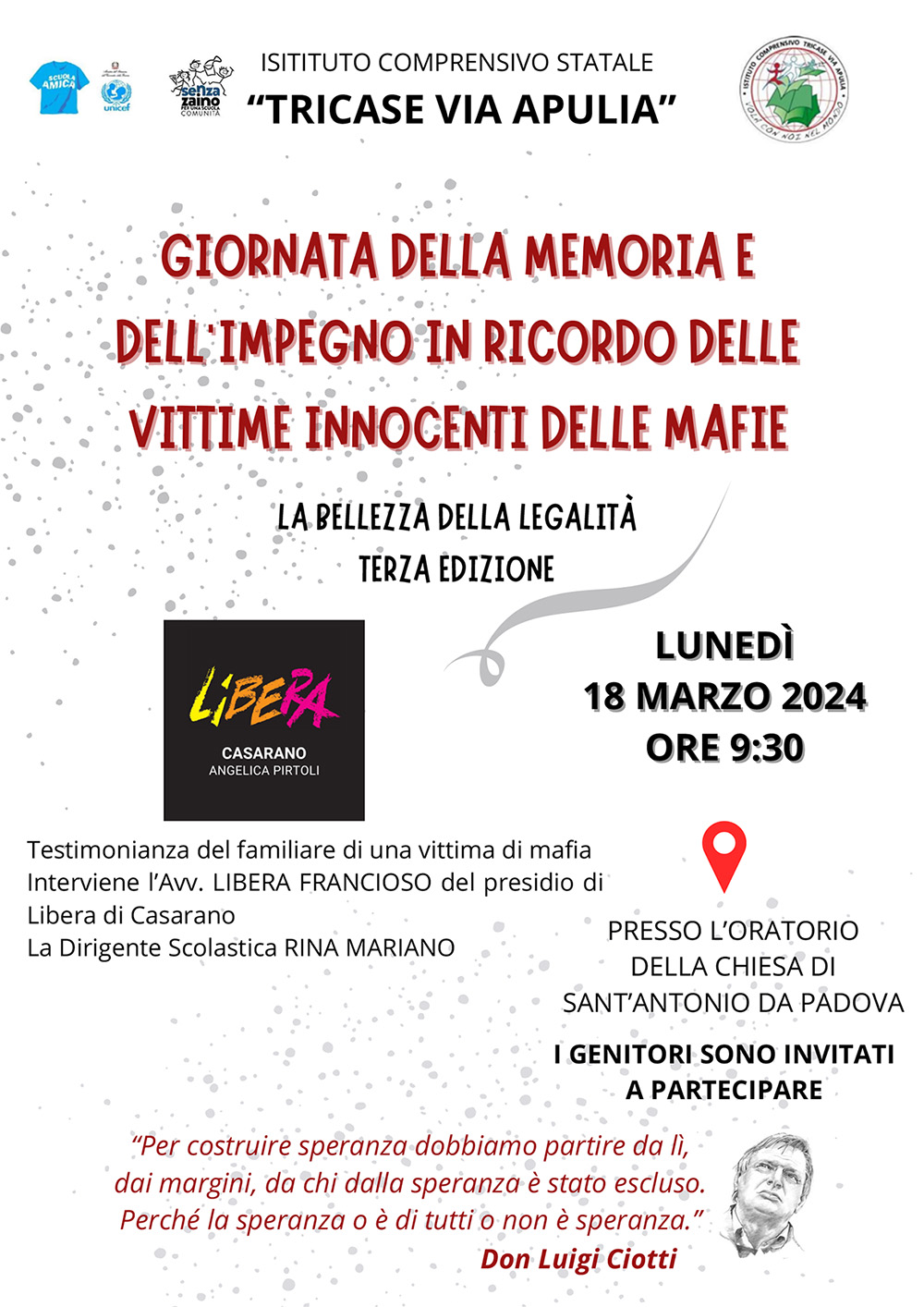 Lunedì mattina, presso l’oratorio della Chiesa di Sant’Antonio l’incontro organizzato dall’Istituto comprensivo “Tricase – Via Apulia”. Interverranno Libera Francioso del presidio di Libera “Angelica Pirtoli” di Casarano e Nadia Rizzello, zia di Angelica Pirtoli, la bimba barbaramente assassinata dalla Sacra Corona Unita, a Parabita, il 20 marzo 1991