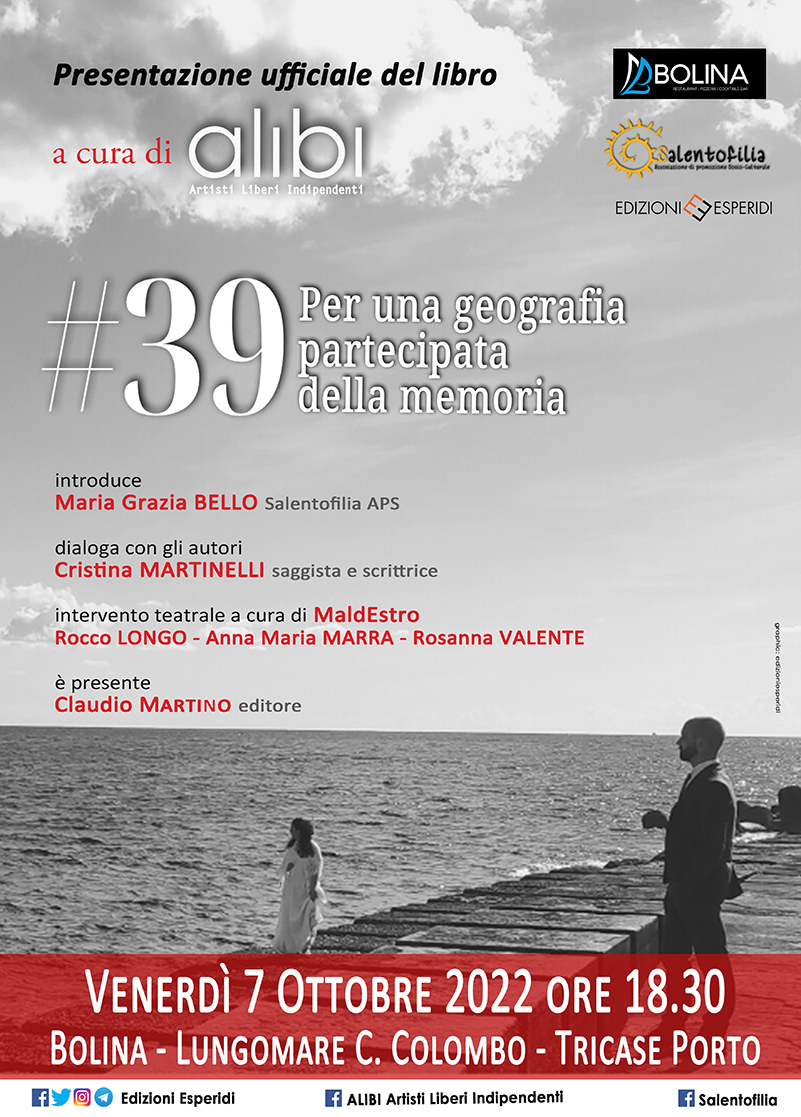 Venerdì 7 ottobre, alle ore 18.30, il Bolina Restaurant di Tricase Porto (lungomare C. Colombo), ospiterà la presentazione ufficiale del volume “#39. Per una geografia partecipata della memoria”, a cura di A.Lib.I. artisti liberi indipendenti, con testo italiano e inglese (trad. di Erina Pedaci) edito da Edizioni Esperidi. Dopo il saluto di Maria Grazia Bello dell’ass. Salentofilia, sarà la scrittrice e saggista Cristina Martinelli a dialogare gli autori Gustavo D’Aversa e Walter Prete.