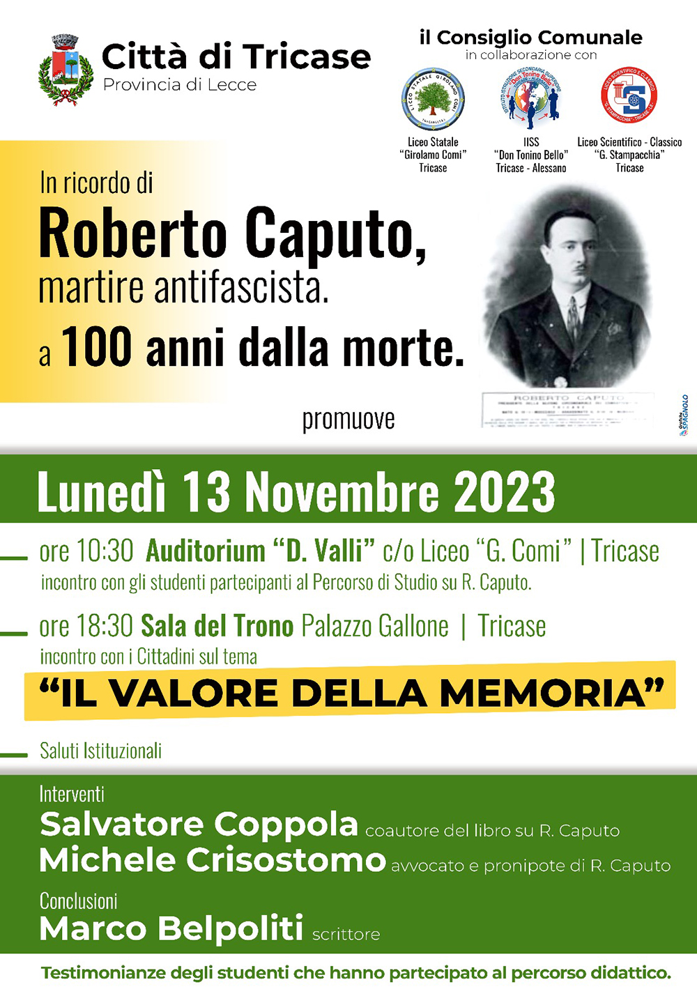 «Nella ricorrenza del centenario, l’impegno dell’intero consiglio comunale è finalizzato a rinsaldare la memoria di Roberto Caputo come patrimonio della nostra comunità cittadina», ha spiegato la vice sindaco Francesca Longo, «crediamo che uno dei luoghi essenziali per questo percorso sia la scuola, per la sua funzione fondamentale nella formazione della coscienza civica dei giovani. Pertanto, abbiamo chiesto e trovato la collaborazione con gli Istituti Scolastici Superiori della città, il Liceo Comi, Il Liceo Stampacchia e l’IISS Don Tonino Bello. Insieme abbiamo attivato laboratori didattici per raccogliere le riflessioni degli studenti delle V classi sull’evento e il contesto storico, che saranno presentate nel corso degli incontri pubblici. Inoltre, gli alunni dell’I.c. Pascoli (che comprende la scuola “R. Caputo”, in onore del martire al quale è stata intitolata la stessa scuola), hanno seguito un progetto didattico e prodotto un elaborato finale (libricino e fumetto che saranno presentati in un’apposita manifestazione sempre nella Sala del Trono il 23 novembre prossimo)».