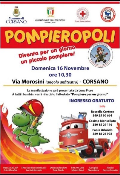 Appuntamento speciale domenica a Corsano con Pompieropoli. Un’occasione unica per i bambini per imparare divertendosi, entrando in contatto con i loro idoli: i vigili del fuoco.