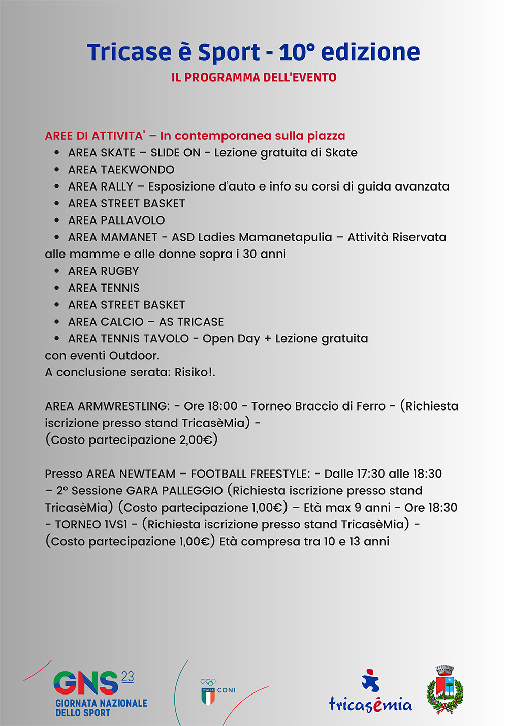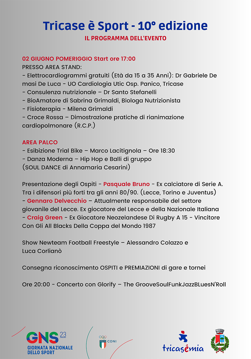 «L’augurio», conclude Gianluca Errico, «è che anche questa decima edizione resti memorabile, continuando a coltivare il nostro sogno di poter sentire affermare da ogni cittadino: “Tricasèmia!”. Grazie a chi ha creduto e continua a credere nella manifestazione e nel progetto Tricase è Sport, continuiamo a generare entusiasmo!».