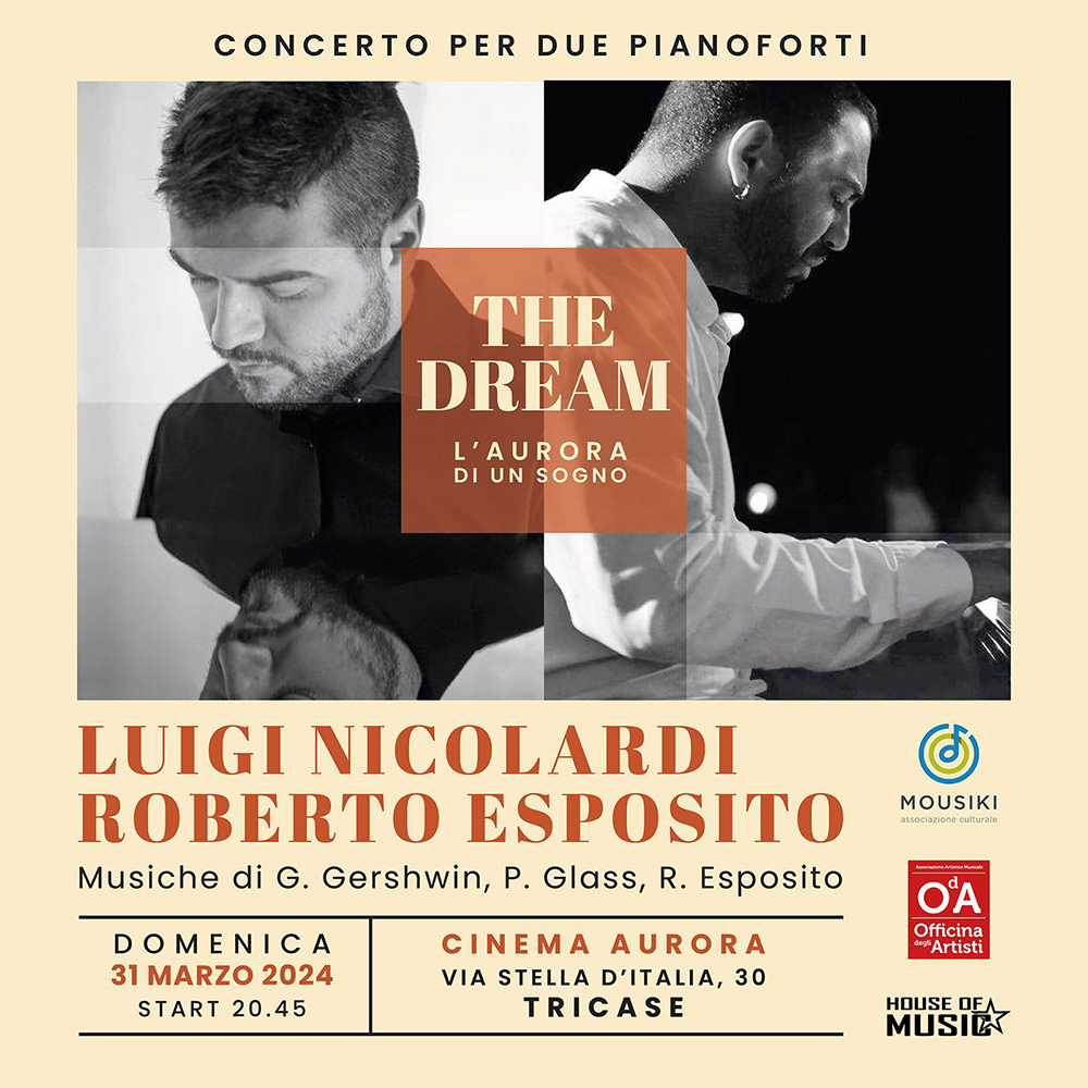 Domenica 31 marzo alle ore 20,45 i pianisti Roberto Esposito e Luigi Nicolardi saranno di scena presso il Cinema Aurora di Tricase, in occasione del concerto… aurorale (nomen omen) di ciò che sarà a tutti gli effetti un sogno che prende vita.