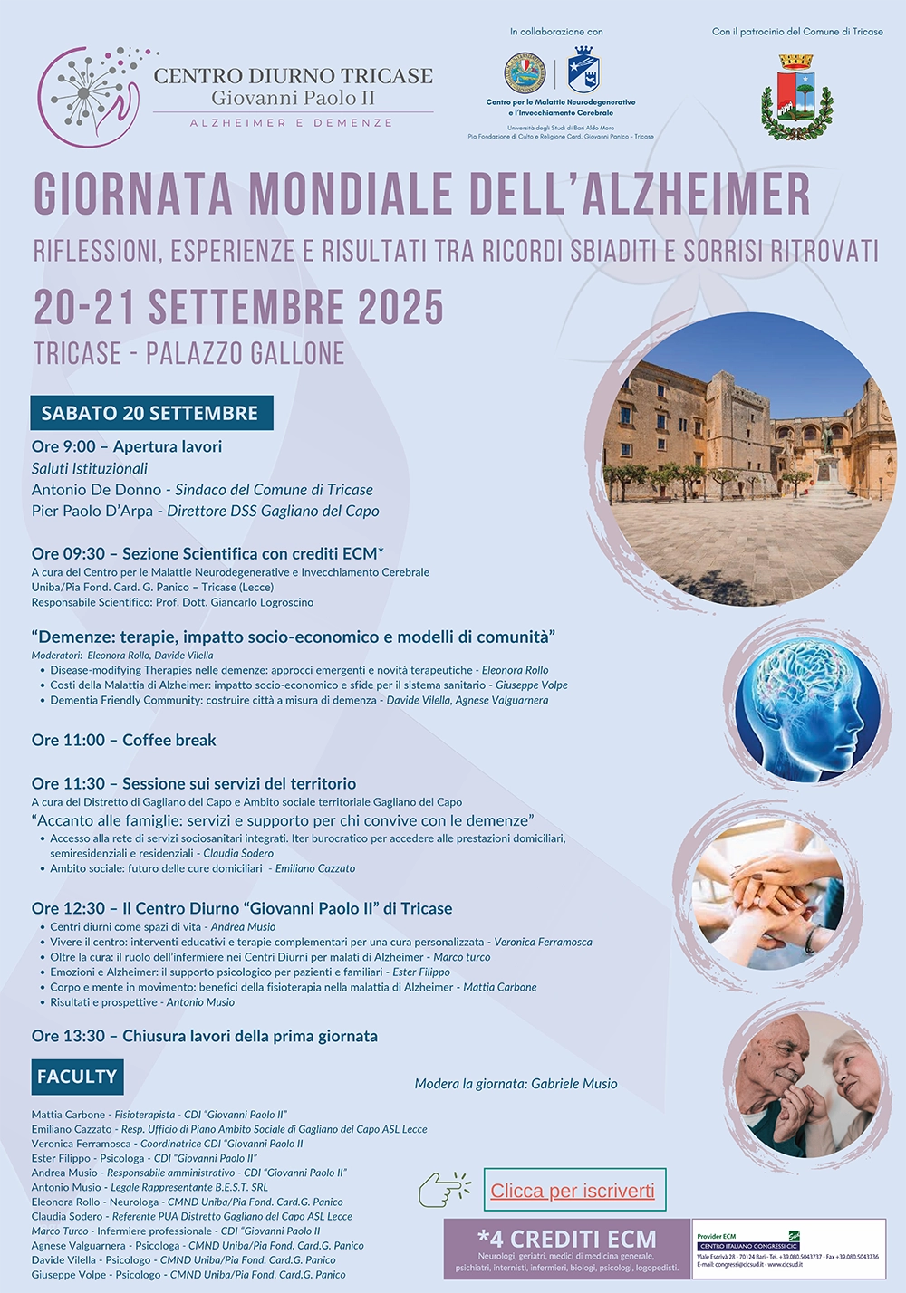 Dalle 9,30 a cura del Centro per le Malattie Neurodegenerative e Invecchiamento Cerebrale Uniba/Pia Fond. Card. G. Panico (Responsabile scientifico: Prof. Dott. Giancarlo Logroscino) la Sezione Scientifica (con crediti ECM*) “Demenze: terapie, impatto socio-economico e modelli di comunità”: su “Disease-modifying Therapies nelle demenze: approcci emergenti e novità terapeutiche” interverrà Eleonora Rollo; su “Costi della Malattia di Alzheimer: impatto socio-economico e sfide per il sistema sanitario”, Giuseppe Volpe, su “Dementia Friendly Community: costruire città a misura di demenza”, Davide Vilella, Agnese Valguarnera.