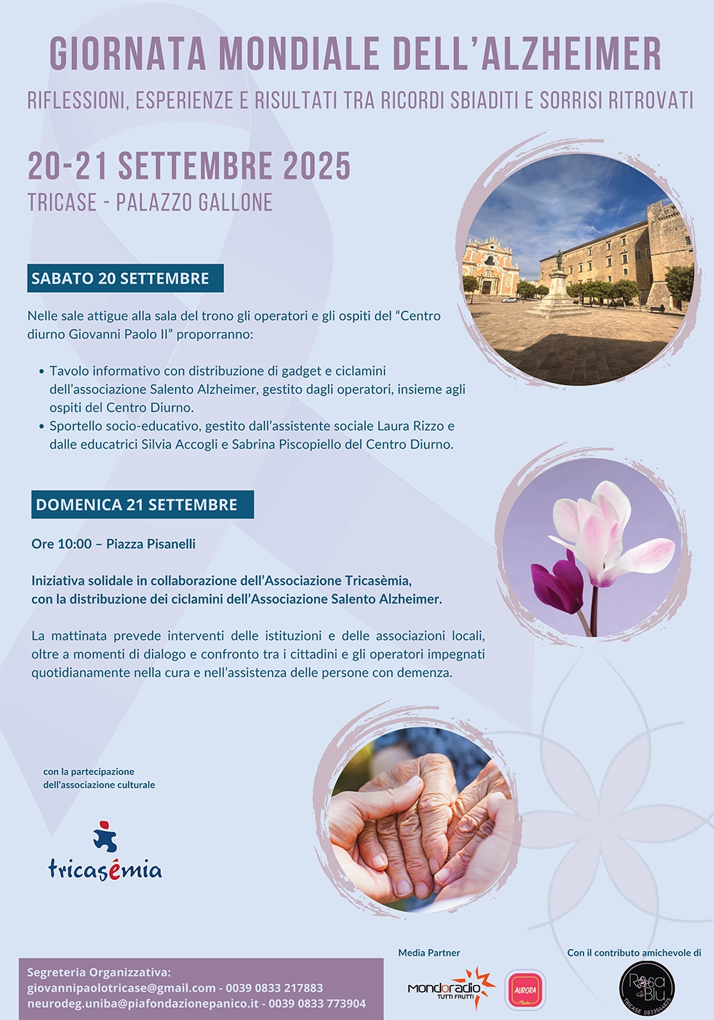 Per la Giornata Mondiale dell’Alzheimer, a Palazzo Gallone due giornate dedicate alla conoscenza, prevenzione e gestione delle demenze. Evento organizzato dal Centro Diurno Giovanni Paolo II, in collaborazione con il locale Centro per le Malattie Neurodegenerative e l’Invecchiamento Cerebrale e con la partecipazione di Tricasèmia