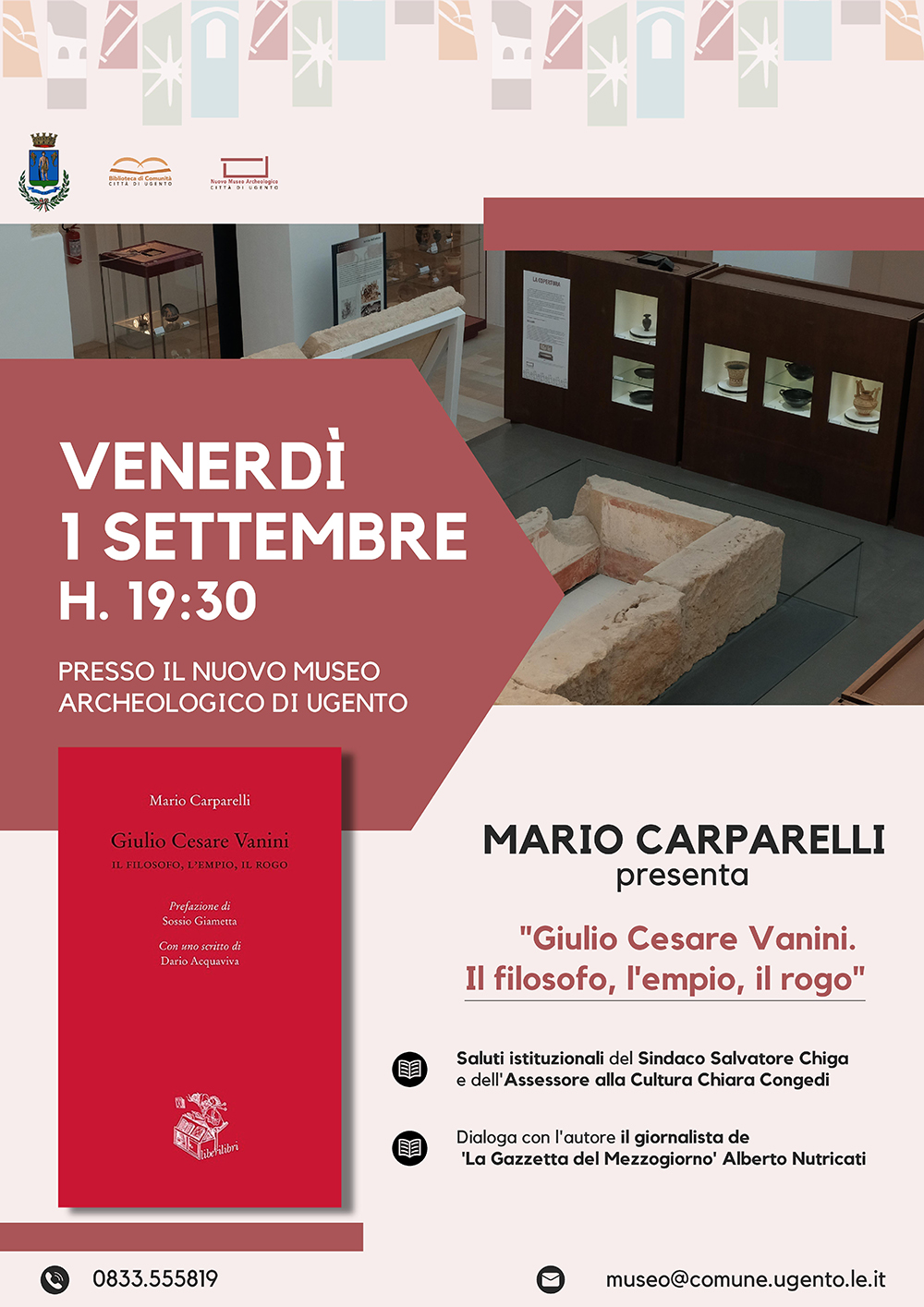 Presso il Nuovo Museo Archeologico di Ugento, il docente dell’Università del Salento, Mario Carparelli (foto in alto), presenterà il libro “Giulio Cesare Vanini. Il filosofo, l’empio, il rogo” (Liberilibri), dedicato al filosofo di Taurisano bruciato per ateismo nel 1619.